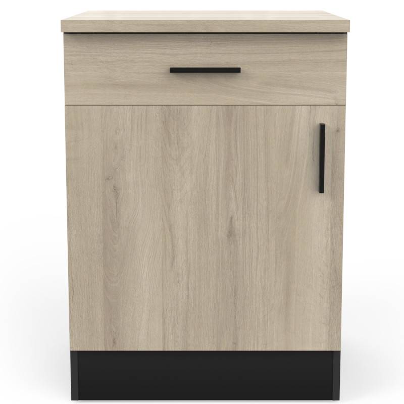 Ühe uksega alumine köögikapp on valmistatud kvaliteetsest melamiinkattega mööbliplaadist, mis on niiskus- ja kriimustuskindel. Kapp on osaliselt kronbergi tamme imitatsioonis ning mustas toonis. Kapi ukse taga üks muudetava kõrgusega vaheriiul. Ülemises osas sahtel.