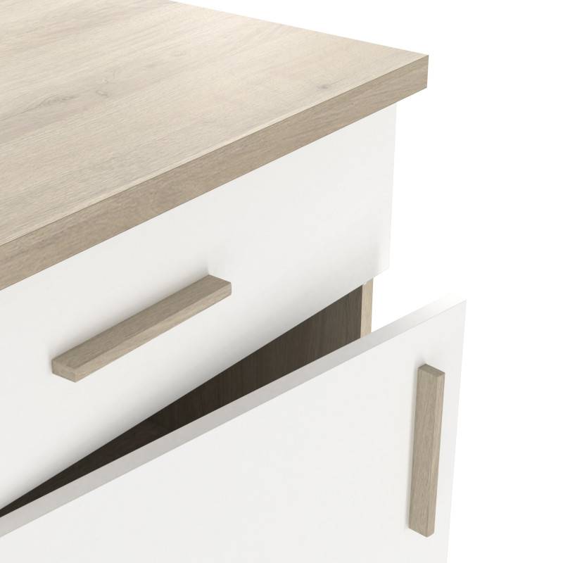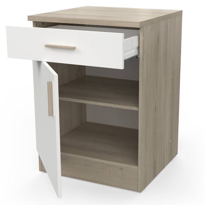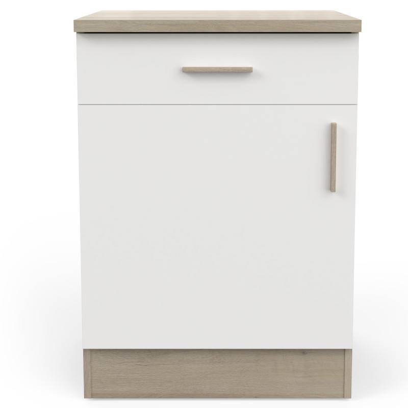 Ühe uksega alumine köögikapp on valmistatud kvaliteetsest melamiinkattega mööbliplaadist, mis on niiskus- ja kriimustuskindel. Kapp on osaliselt kronbergi tamme imitatsioonis ning valges toonis. Kapi ukse taga üks muudetava kõrgusega vaheriiul.