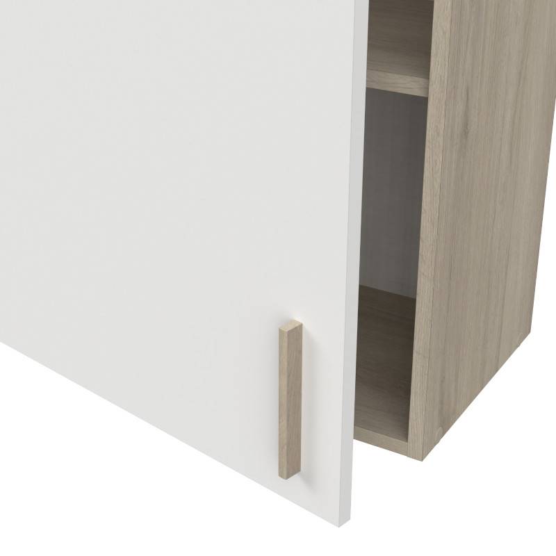Ühe uksega ülemine köögikapp on valmistatud kvaliteetsest melamiinkattega mööbliplaadist, mis on niiskus- ja kriimustuskindel. Kapp on osaliselt kronbergi tamme imitatsioonis ning valges toonis. Kapi ukse taga üks muudetava kõrgusega vaheriiul.