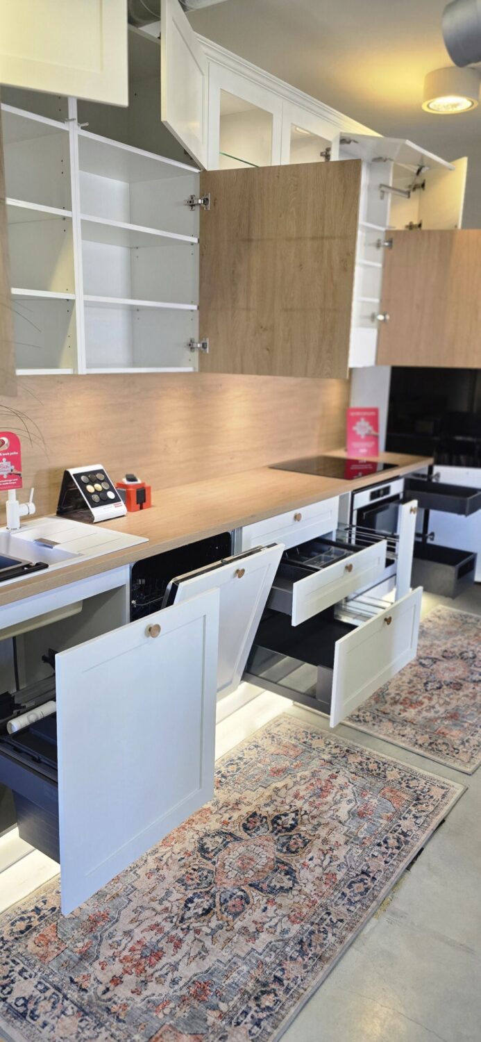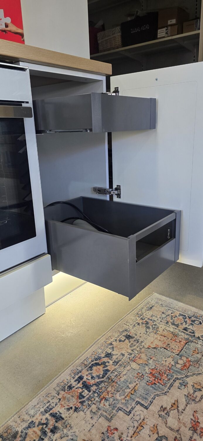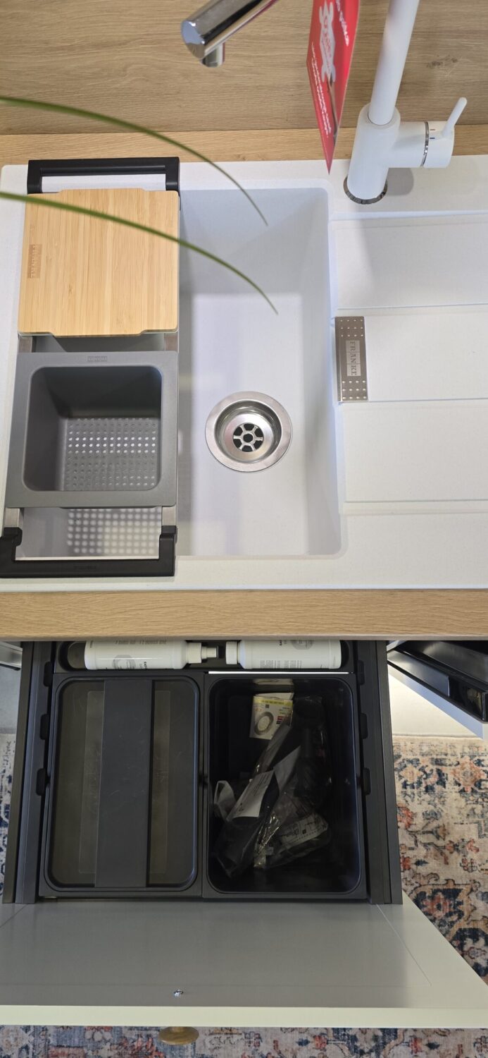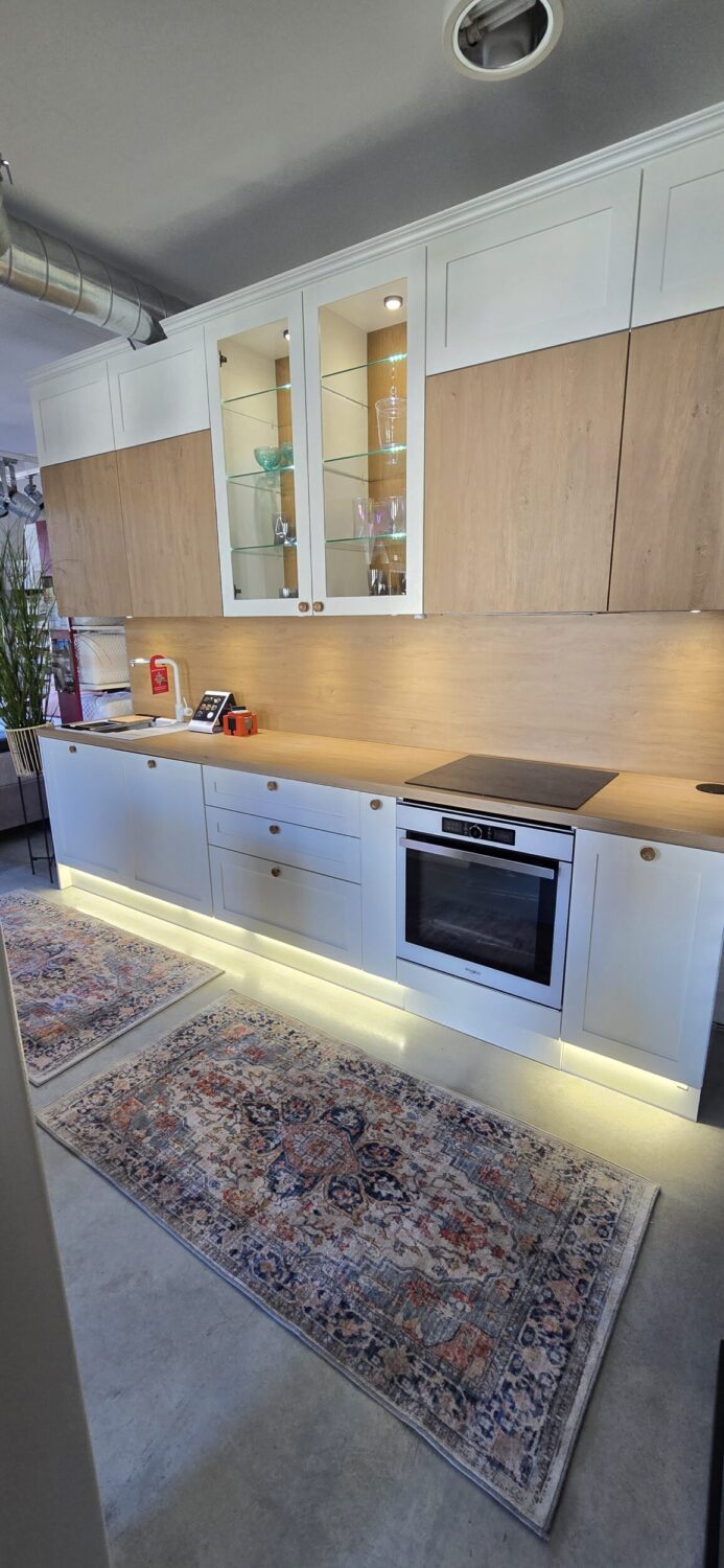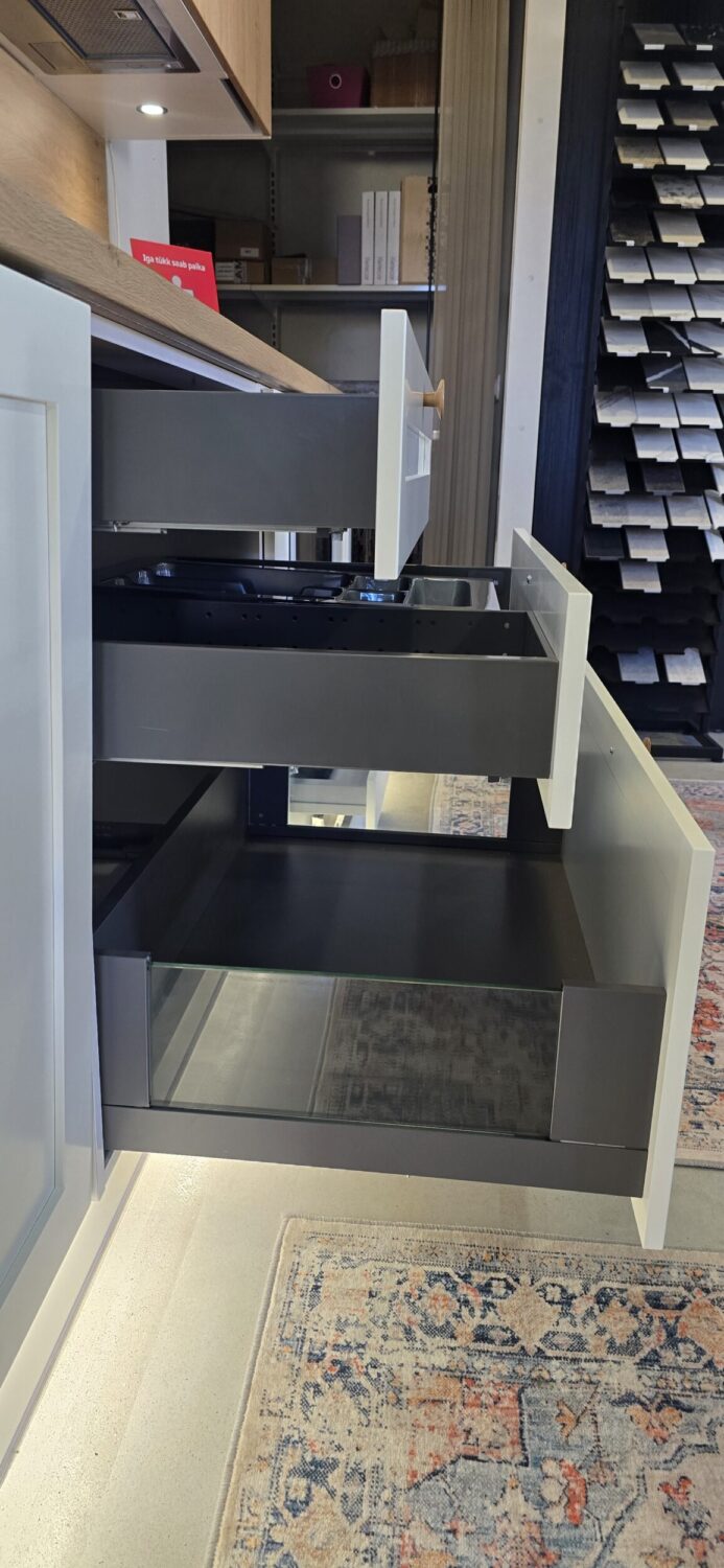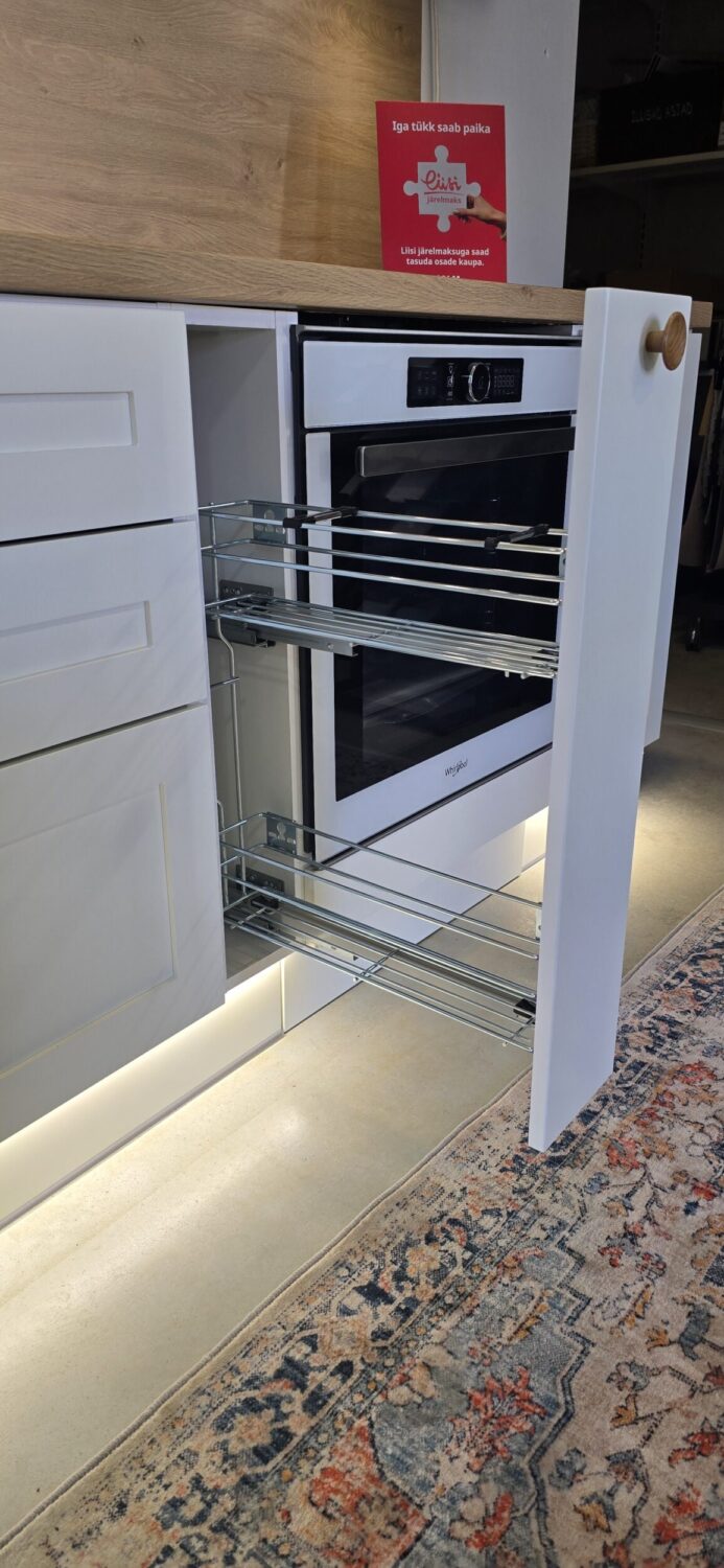 Hinnas on kogu köögimööbli sees olev furnituur (Franke 2 prügikastiga sorter valamukapis, cargo, sisesahtlid 2 tk). Ahju all on soklisahtel ning terve sokli ulatuses sokli-ledvalgustus.