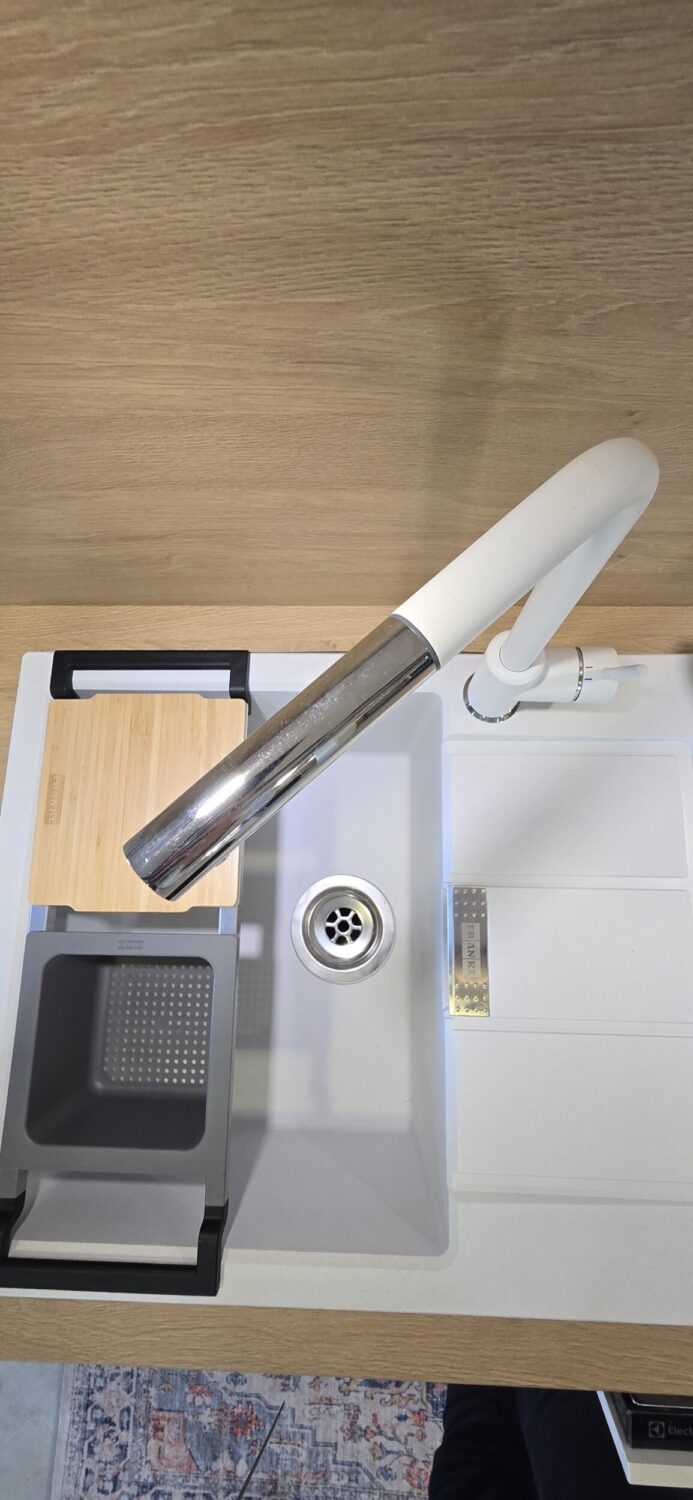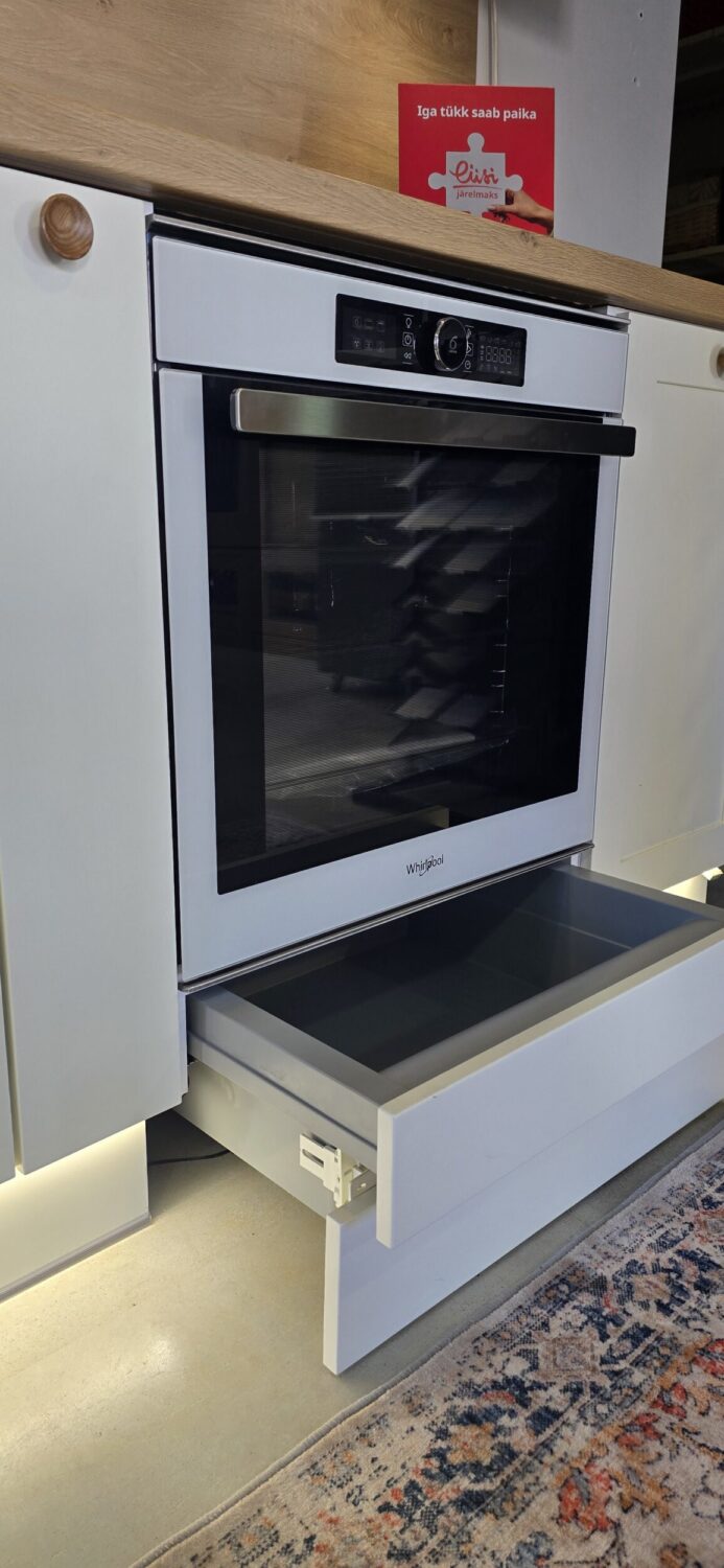 Komplekti kuuluvad pildil olevad segisti ja valamu (tectonite, Franke) ning köögitehnika (Electroluxi pliidiplaat LIL61434C induktsioonja nõudepesumasin EEQ47202L, Whirlpooli ahi AKZM8480WH). Õhupuhasti kapis on Elica ERA S IX/A/52 täisintegreeritud õhupuhasti.