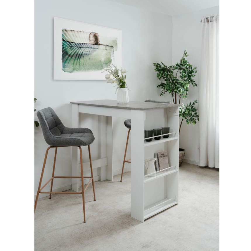 Baarilaua mõõdud teevad sellest praktilise valiku ka väiksematesse köökidesse või korteritesse. Laua vastupidavuse tagab melamiin kattega mööbliplaat ning see on saadaval erinevates viimistluses. Küljel olevad kolm riiulit pakuvad praktilist hoiuruumi. See on mugav lahendus hommikusöökideks, kiireks kohvipausiks või õhtusteks vestlusteks.