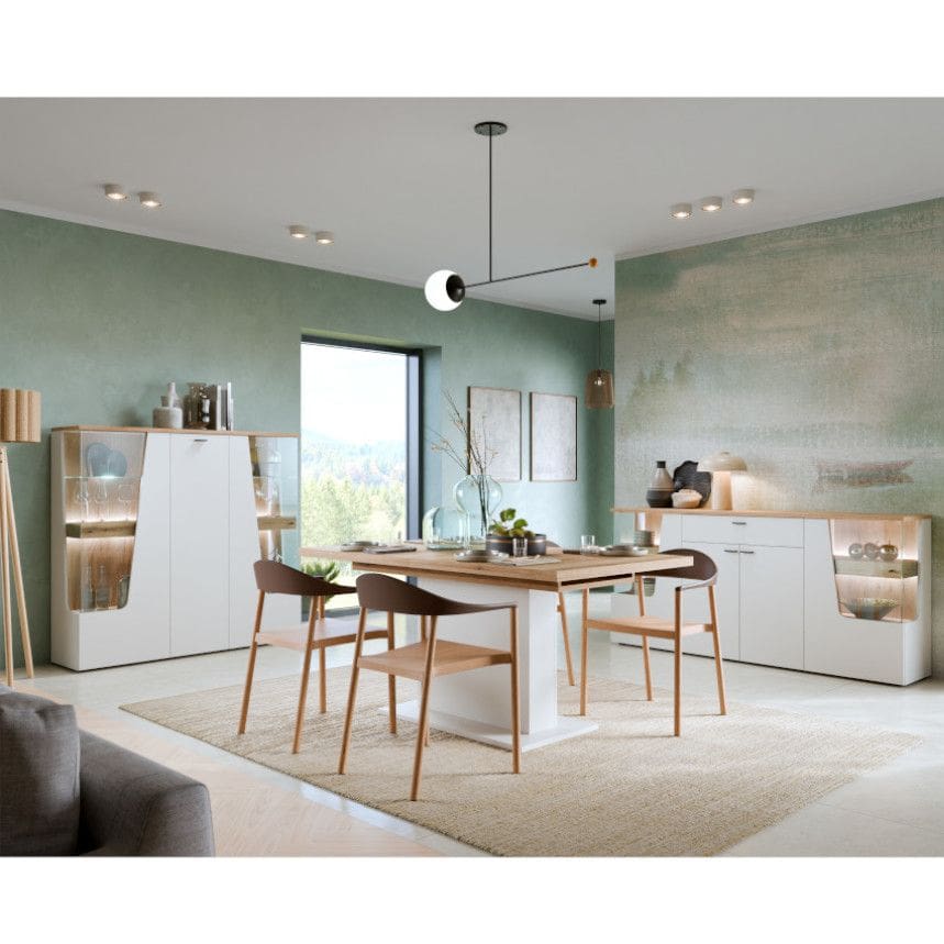 Kogu sarja mööbel on valmistatud melamiinkattega mööbliplaadist. Geomeetriline disain avaldab muljet oma modernse joonega. Söögilaud on pikendatav vahemikus 160-200 cm. Pikendusplaati saab hoiustada lauaplaadi all.