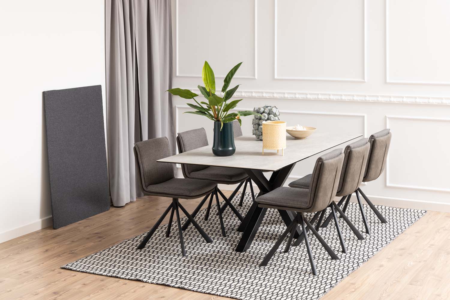 Kaasaegne julge välimusega söögilaud. Laua hallid toonid annavad sellele karge ilme. Lauaplaat on valmistatud kuuma- ja kriimustuskindlast keraamikast. Must skulptuurne metallist ristalus tagab stabiilsuse. Mahutab mugavalt 8 inimest. Toote mõõdud on 200x100xH75,5cm.