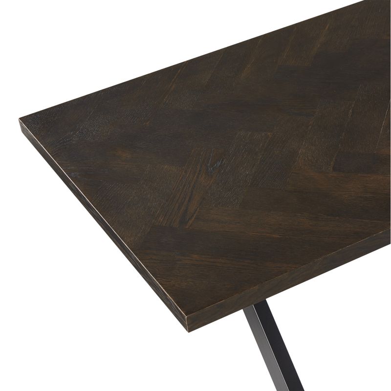 Söögilaud ROWAN 200x90xH75cm, kalasaba suitsutamm. Lauaplaat: kalasaba mustrisse laotud naturaalse tammespooniga mööbliplaat. Lauaplaat on viimistletud tumeda lakiga. Laua ristjalad on valmistatud metallist ja viimistletud musta pulbervärviga.