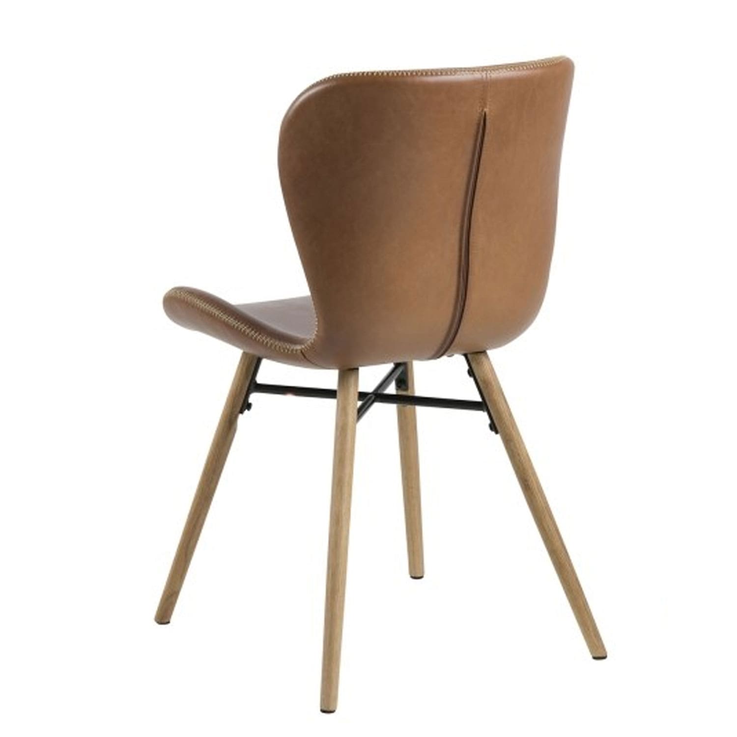 Tool BATILDA 47x53xH82,5cm. Mitmekülgne tool täiustab iga söögituba kaasaegse välimusega. Orgaanilise kujuga tool on kaetud pruuni kunstnahaga. Kumer seljatugi toetab ja lisab mugavust. Õlitatud tugevate tammejalgadega tool on stabiilne ja samal ajal stiilne. Iste/seljatugi: kunstnahk, värvus: brändi, kreemikad õmblused. Jalad: tamm, metall. Istumiskõrgus: 46,5cm. Kaalupiirang: 110kg. HOOLDUS: Puhastage seebiveest või PU (polüuretaan) pindade puhastusvahenditest kuivaks väänatud lapiga ja pühkige pind kuivaks. Kasutage ainult PH neutraalseid (7,0) puhastusvahendeid. Ärge asetage mööblit otsese päikesevalguse kätte.