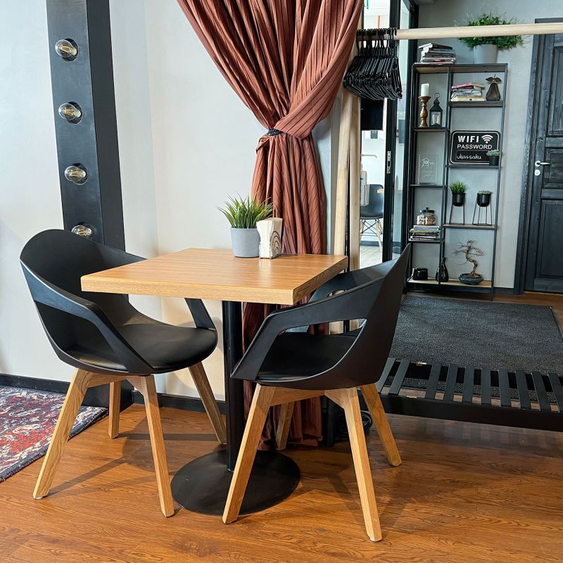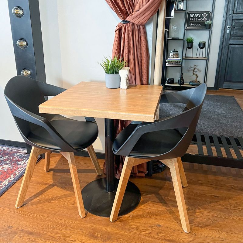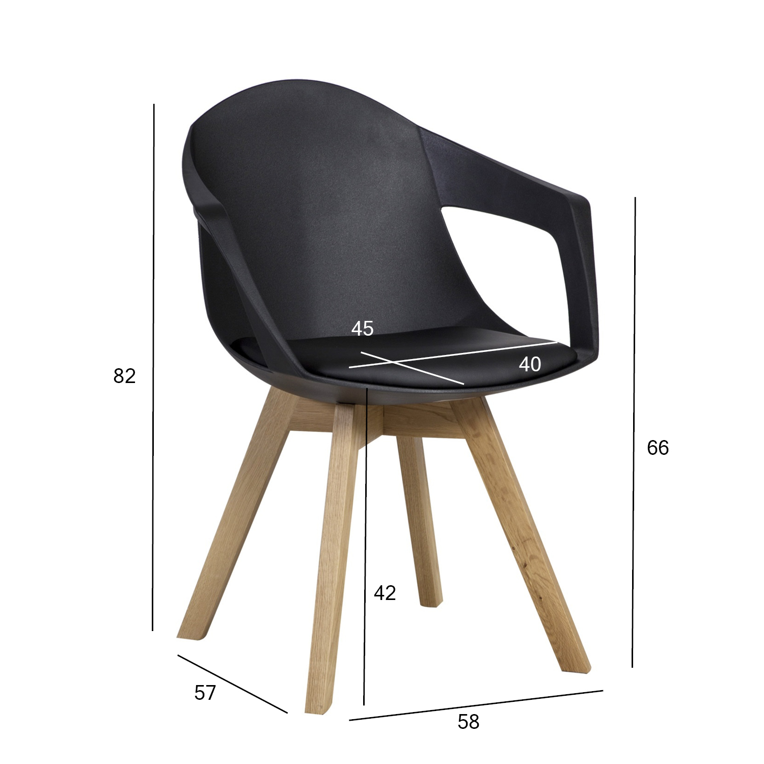 Tool STUART. Toolil on mugava vormiga must plastikust iste. Polsterdatud istmepõhi on kaetud musta kunstnahaga. Heledad tammepuidust jalad. Tooli üldmõõdud on 58x57xH88cm. Istme kõrgus 42cm, istme laius 40cm, istme sügavus 45cm. Kaalupiirang 100kg.