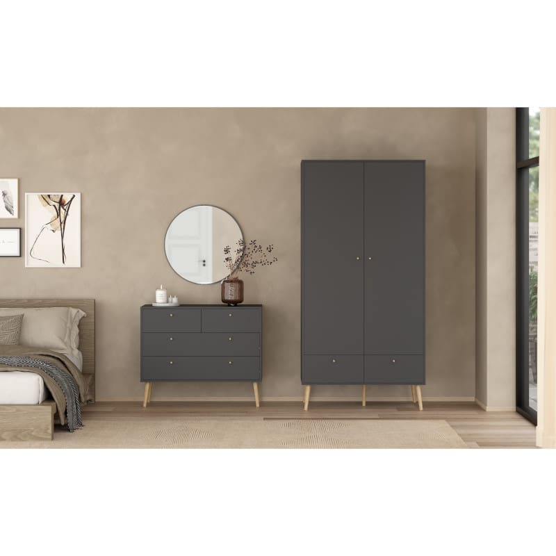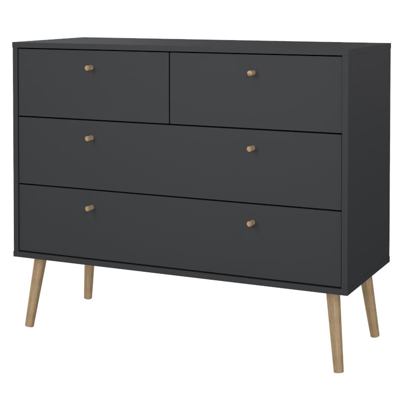 Kogu sarja mööbel on valmistatud mööbliplaadist ning see on saadaval kahes viimistluses- valge ja matt hall. Jalad ning käepidemed on tammepuidust. Kummutil on neli sahtlit ja see pakub palju hoiuruumi. Jalgade kõrgus 20 cm.