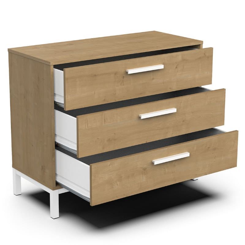 Kogu sarja mööbel on valmistatud melamiinkattega mööbliplaadist ning jalad pulbervärvitud metallist. Kummutil on kolm sahtlit.