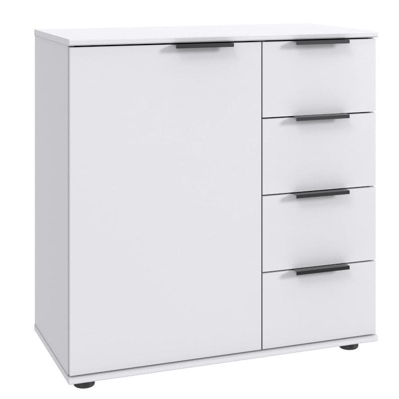 Kummuti vastupidavuse tagab kvaliteetne puitlaastplaat ja ABS nurgad. Kummutil on plastik jalad. Uste taga on reguleeritava kõrgusega vaheriiulid, vasakul mõõdus 74.8 x 35.6 x 16 cm ja selle kõrval mõõduga 37 x 35.6 x 16 cm. Sahtlid liiguvad metallsiinidel.