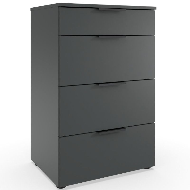 Kogu sarja mööbel on valmistatud mööbliplaadist. Kummutil on neli metallsiinidel liikuvat sahtlit. Kummut on grafiit hallis toonis. Käepidemed mustas toonis.