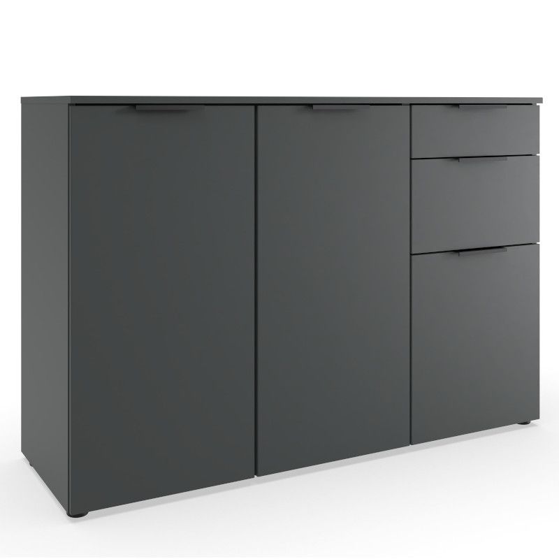 Kogu sarja mööbel on valmistatud mööbliplaadist. Kummutil on kaks metallsiinidel liikuvat sahtlit. Kahe suurema ukse taga on kaks vaheriiulit ning alumise väikse ukse taga üks riiul. Kummut on grafiit hallis toonis. Käepidemed mustas toonis.