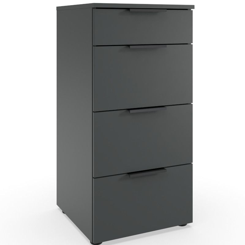 Kogu sarja mööbel on valmistatud mööbliplaadist. Kummutil on neli metallsiinidel liikuvat sahtlit. Kummut on grafiit hallis toonis. Käepidemed mustas toonis.
