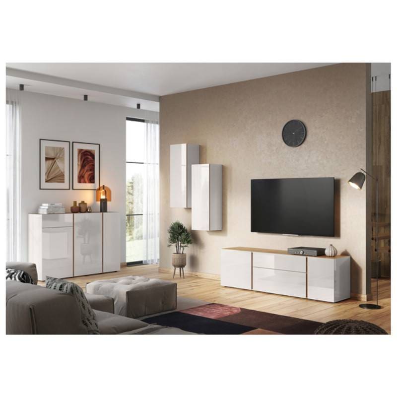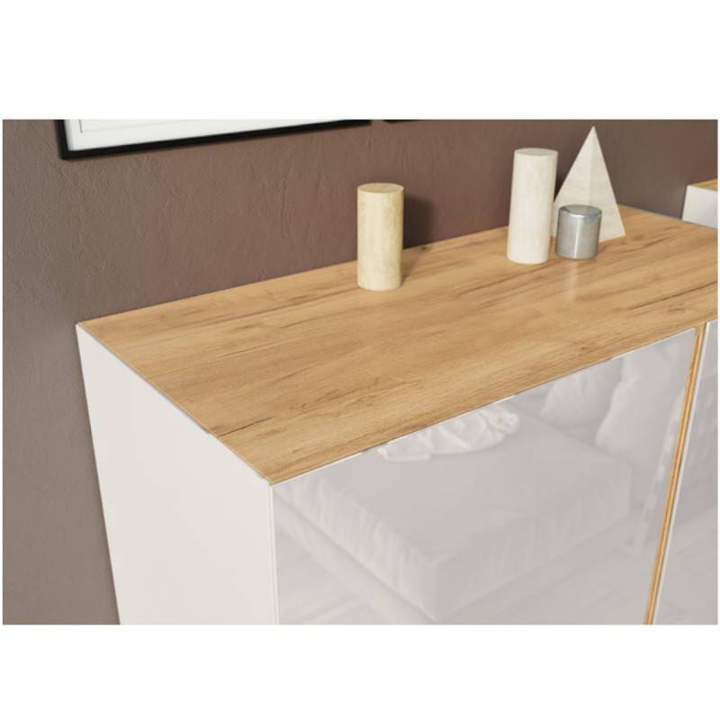 Mööbli vastupidavuse tagavad hoolikalt valitud materjalid. Kapp on valmistatud melamiin kattega mööbliplaadist, uksed on kaetud tugeva karastatud klaasiga, mis tagab kõrgläikelise välimuse. Kapi sisu on navarra tamme imitatsiooniga. Kogu valikus olev mööbel on varustatud kvaliteetsete ABS-äärtega. Uksed ning sahtel on soft-close süsteemiga. Kummuti iga ukse taga on reguleeritava kõrgusega riiulid.