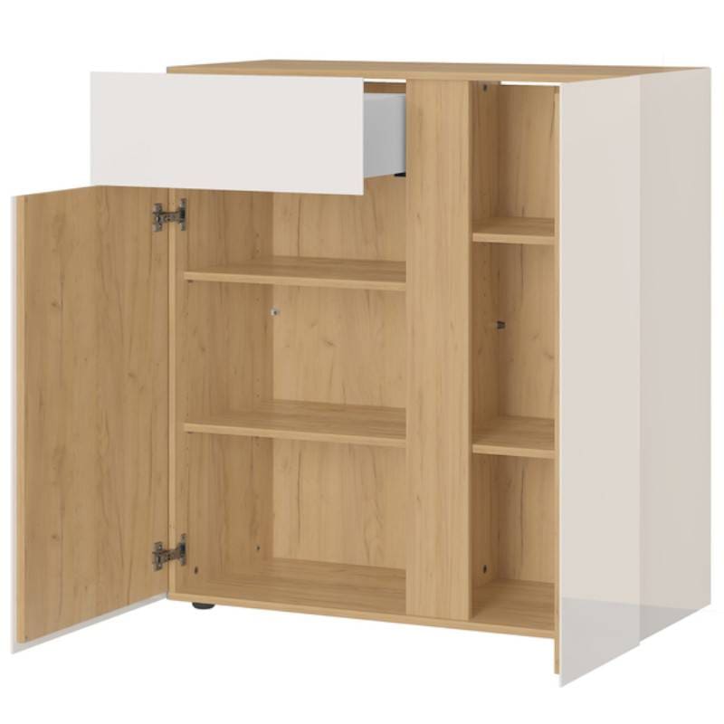 Mööbli vastupidavuse tagavad hoolikalt valitud materjalid. Kapp on valmistatud melamiin kattega mööbliplaadist, uksed on kaetud tugeva karastatud klaasiga, mis tagab kõrgläikelise välimuse. Kapi sisu on navarra tamme imitatsiooniga. Kogu valikus olev mööbel on varustatud kvaliteetsete ABS-äärtega. Uksed ning sahtel on soft-close süsteemiga. Kummuti kahe ukse taga on mõlemal pool kaks reguleeritava kõrgusega vaheriiulit.