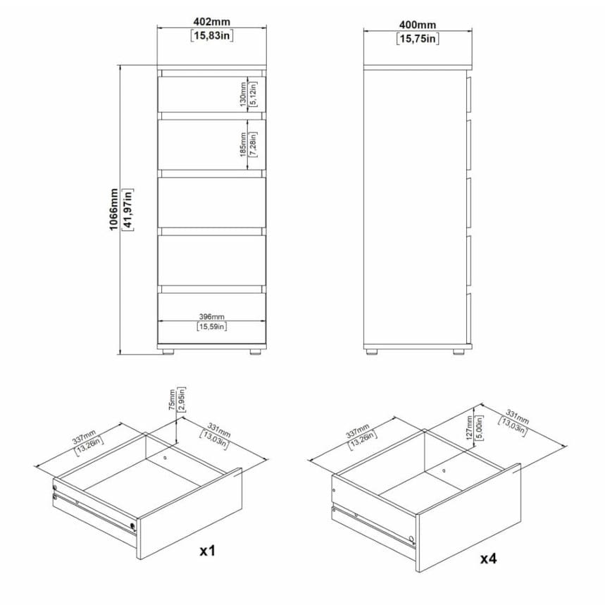 Kogu sarja mööbel on valmistatud mööbliplaadist ning saadaval valges toonis ja puiduse hickory viimistlusega. Kummutil on viis metallsiinidel sahtlit. Sahtlite kandevõime 3-5 kg. Pealmise plaadi kandevõime kuni 15 kg. Jalad plastikust.