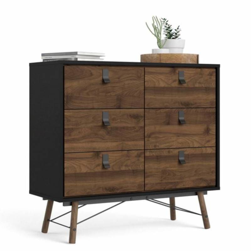 Kummut on valmistatud kvaliteetsest pähkli imitatsiooniga mööbliplaadist. Kuus sahtlit liiguvad mugavalt metallsiinidel, ühe sahtli maksimaalne kandevõime on kuni 6 kg. Kummutil on puidust jalad, 22cm kõrged. Aktsendiks jalgadele on metallist detailid. Kapi pealmise plaadi kandevõime on kuni 20 kg.