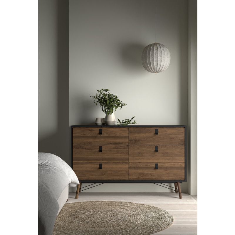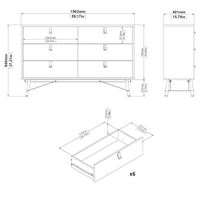Kummut on valmistatud kvaliteetsest valgest mööbliplaadist. Kuus sahtlit liiguvad mugavalt metallsiinidel, ühe sahtli maksimaalne kandevõime on kuni 9 kg. Kummutil on puidust jalad, 22cm kõrged. Aktsendiks jalgadele on metallist detailid. Kapi pealmise plaadi kandevõime on kuni 30 kg.