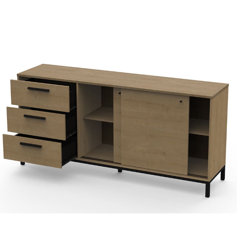 Kogu sarja mööbel on valmistatud melamiinkattega mööbliplaadist ning jalad pulbervärvitud metallist. Kummutil on kolm sahtlit ning kaks lükandust.