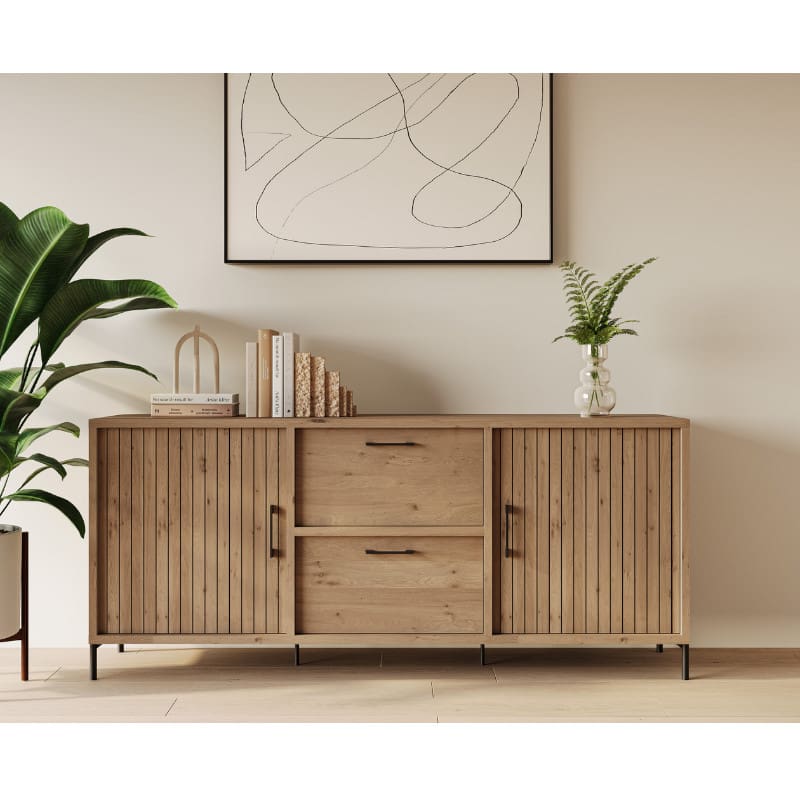 Kogu sarja mööbel on valmistatud kvaliteetses mööbliplaadist on millenium tamme imitatsioonis. Puhvetkummutil on kaks ust ja kaks metallsiinidel liikuvat sahtlit, mis pakuvad piisavalt hoiuruumi ja mugavust. See disain võimaldab sul hoida esemeid organiseeritult ning hõlpsasti ligipääsetavana.