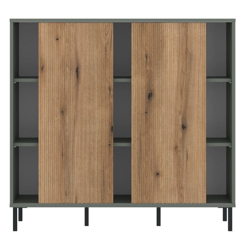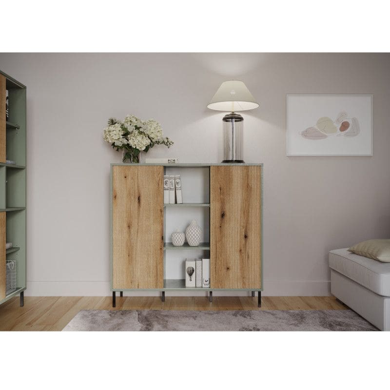 Puhvetkummut on valmistatud salveirohelises toonis lamineeritud puitlaastplaadist. MDF-ist puitu imiteeriv esiosa on valmistatud soonetehnikas. Kummuti juurde kuuluvad mahukad riiulid, mida on võimalik osaliselt lükanduksega katta. Tänu lükanduste esikülgedele saate muuta mööbli välimust, rõhutades selle ainulaadsust ja kasutamise praktilisust. Jalad metallist.