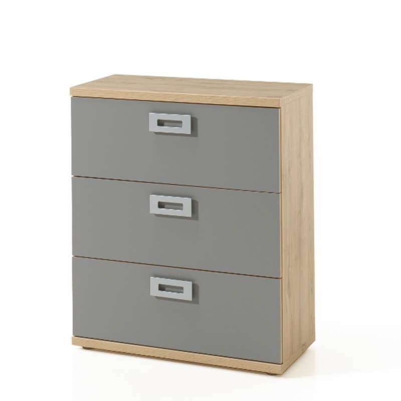Kummut on valmistatud kvaliteetsest puitlaastplaadist ning karkass on viimistletud tamme imitatsiooniga. Kummuti kolm sahtlit on viimistletud halli tooniga.