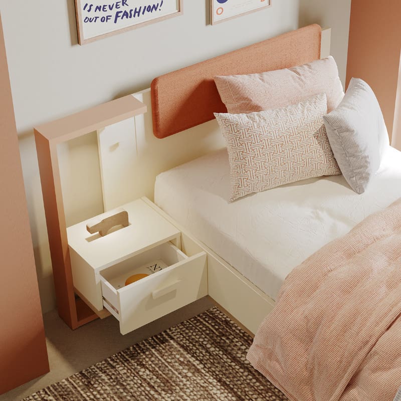 Kogu sarja mööbel on valmistatud mööbliplaadist ning saadaval kahes viimistluses- terrakota/beež ning clay/hall. Öökapp sobib kokku sama sarja voodiga, pakkudes mugavat lisaruumi raamatutele ja muudele tarvikutele. Sellel on üks sahtel ning kaks riputus konksu. Öökapi ülemise ääre all on ka LED valgusti.