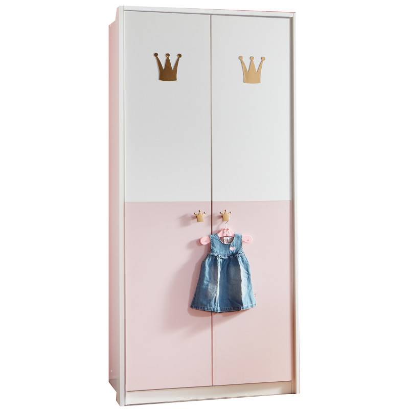 Riidekapp on valmistatud vastupidavast lamineeritud puitlaastplaadist. Kapp on osaliselt valges ja roosas toonis, ustel kudlsed detailid. Riidekapil on kaks ust. Kapiga on kaasas kaks riidepuutoru ning neli vaheriiulit, saate ise paigutada vastavalt soovile. Käepidemed on krooni kujulised, valmistatud plastikust. Kapi uksed on soft-close süsteemiga.