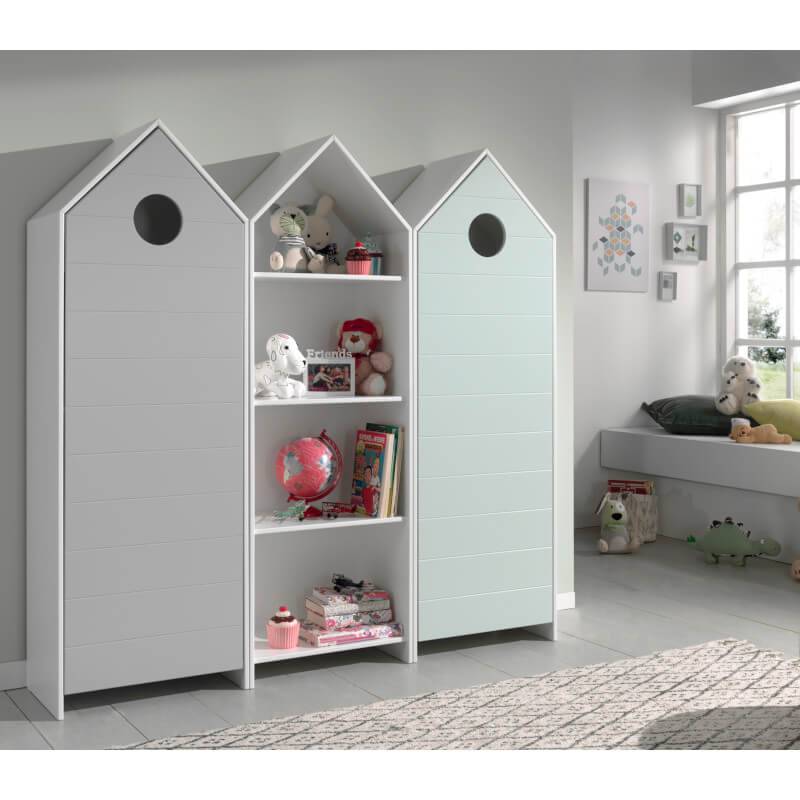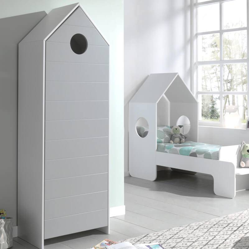 Riidekapp on valmistatud kvaliteetsest valges toonis mööbliplaadist ning uks hallist. Kapil on kolm vaheriiulit, nende vaheline kõrgus on 38 cm, vaheriiuli sügavus on 35 cm. Riidekapi uksel on ava, mille läbimõõt on 15 cm.