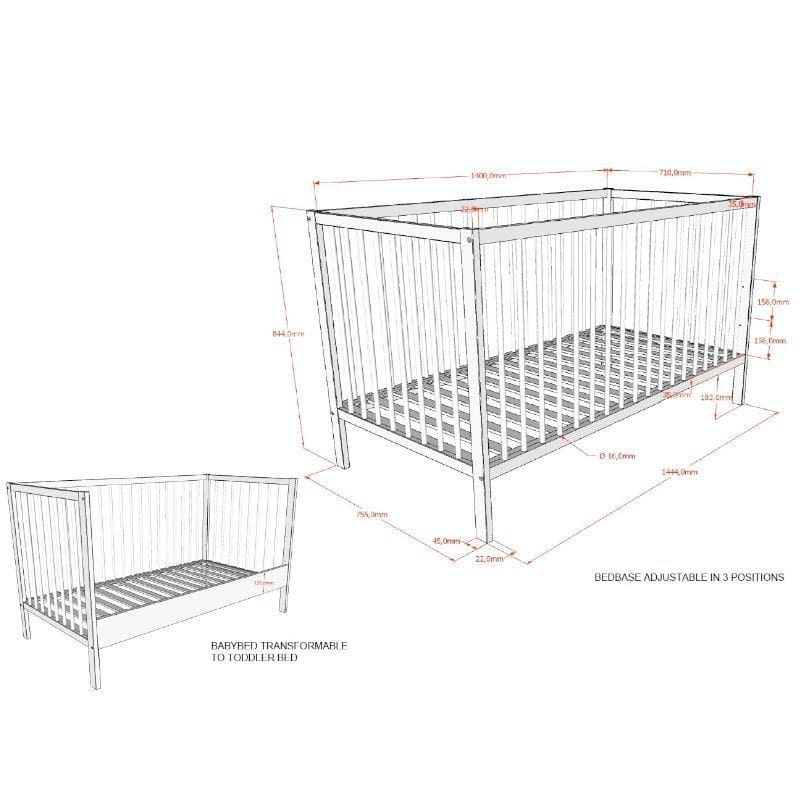 Sarja mööbel on valmistatud pöögipuidust. Voodi põhja saab reguleerida kolmele erinevale kõrgusele ja eemaldada 3 latti, mistõttu on voodit lihtne beebi kasvuvajadustele vastavaks kohandada. Maksimaalne kandevõime kuni 30 kg. Madratsi maksimaalne kõrgus kuni 10 cm.