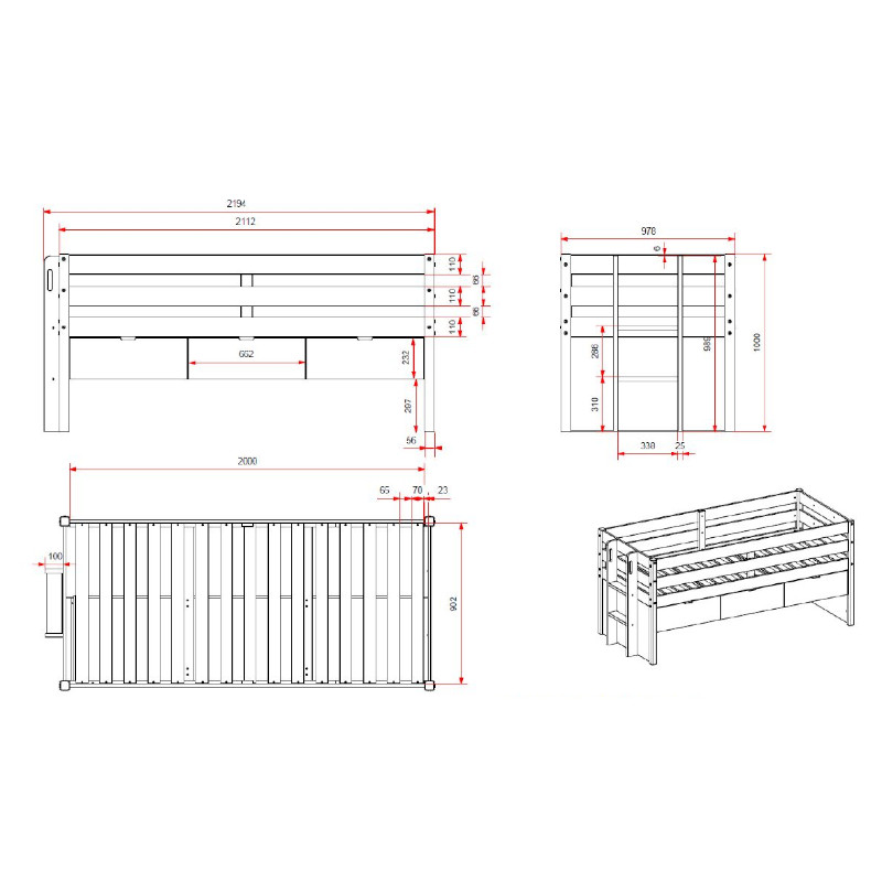 Lihtsa disainiga voodi on funktsionaalne ning kompaktne. Voodi on valmistatud männipuidust. Voodilipid on kaasas, madrats ei ole- sobib suurusega 90×200 cm. Maksimaalne kandevõime on kuni 75 kg. Kolmest küljest piiratud voodi kaitseb kukkumiste eest, soovi korral keerates voodi vastu seina, on magamine turvalisem. Kolm sahtlit annavad lisamugavust.