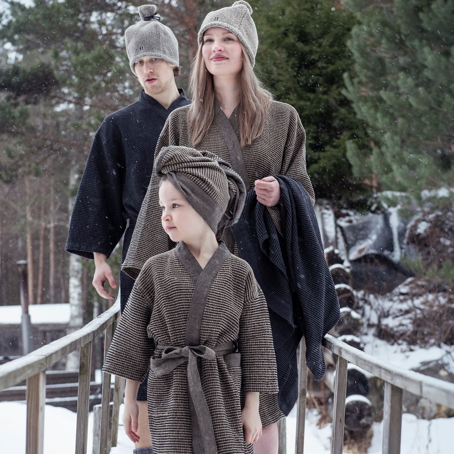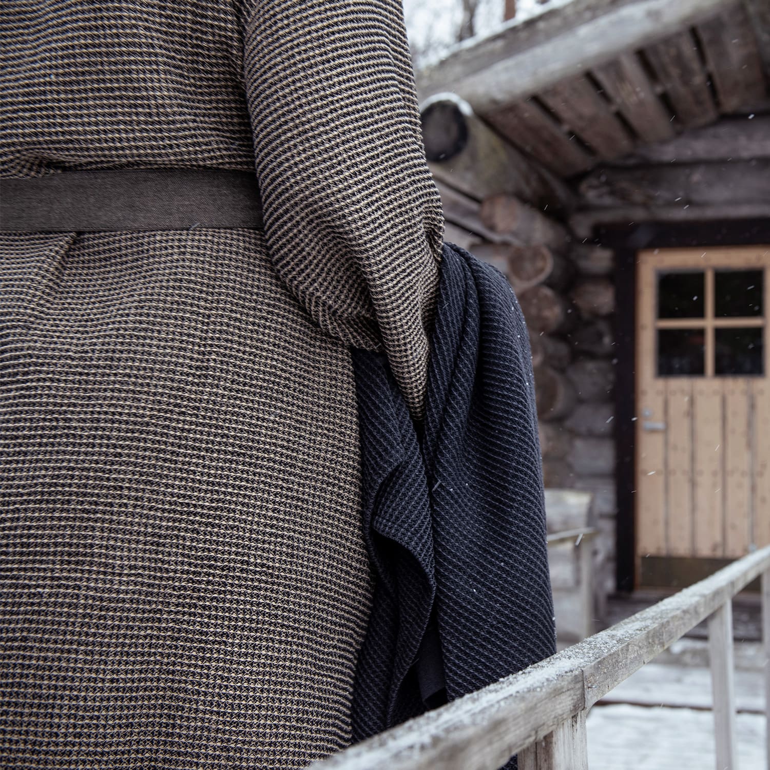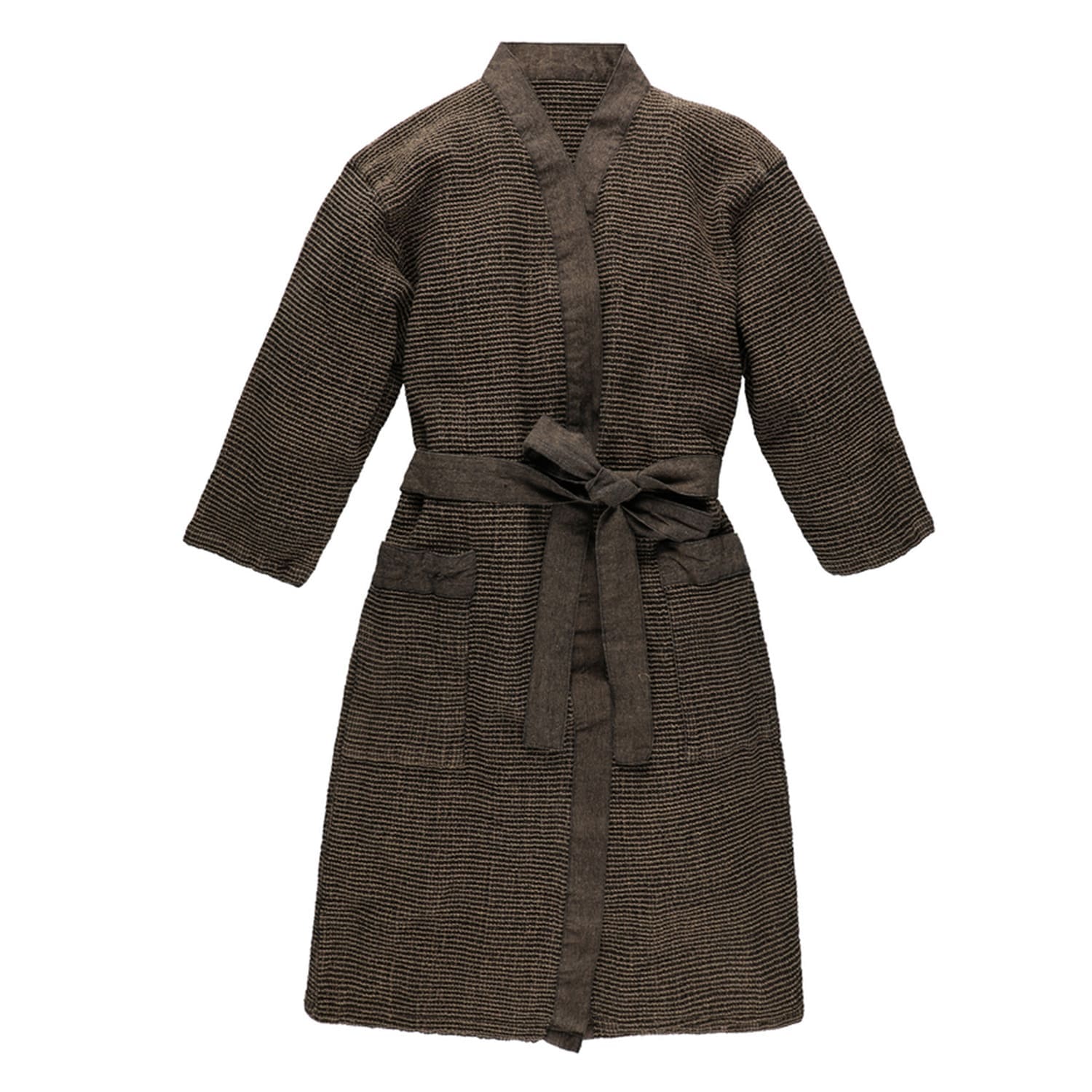 Hommikumantel RENTO BROWN, S/M. Taaskasutatud puuvillast tehtud hommikumantlil on chambray-kandid ja vöö. Pehme ja kerge puuvillane materjal on naha vastu jahe, imab hästi niiskust ja kuivab kiiresti. Materjal: 75 % puuvilla, 25 % polyester. Enne kasutamist pesta. Kahaneb esimesel pesukorral umbes 5%.