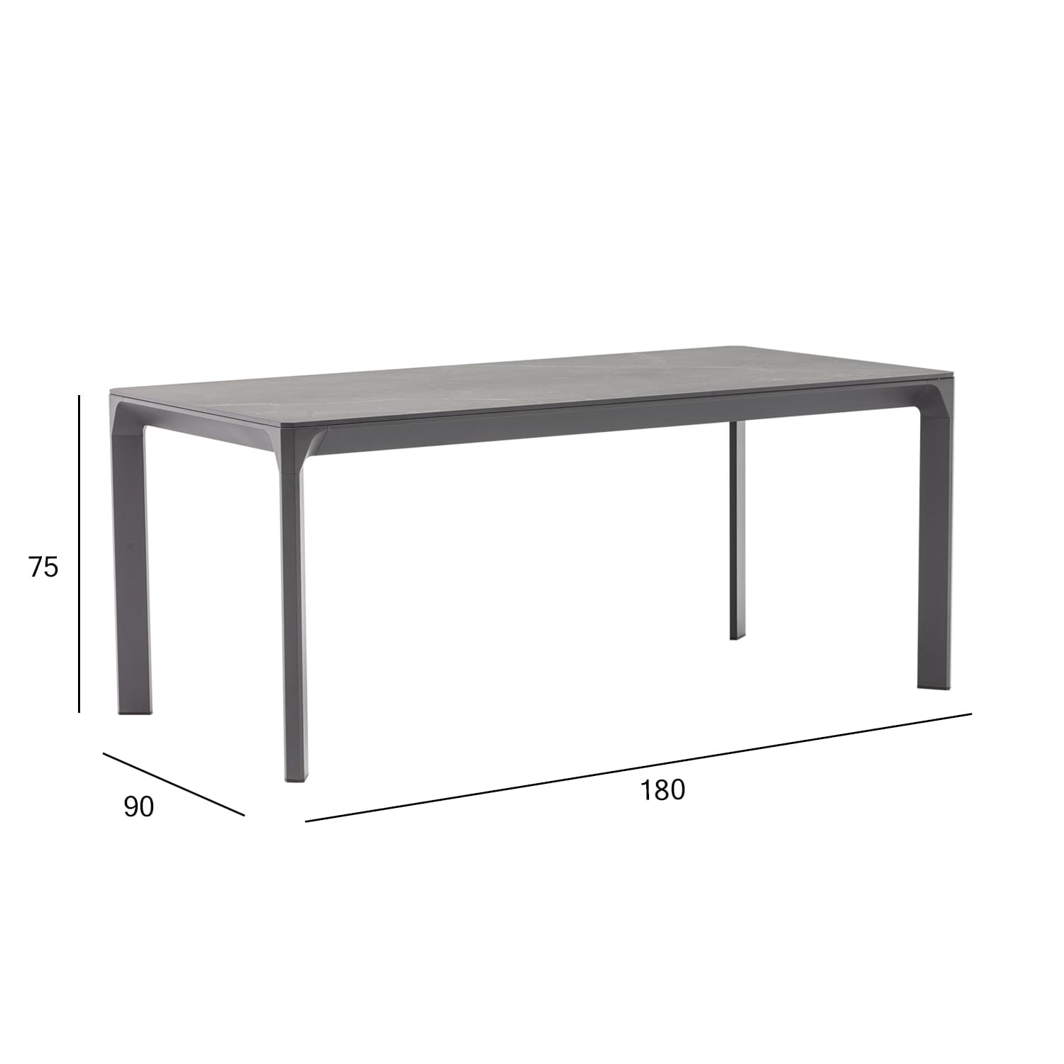 Laua mõõdud 180x90xH75cm, lauaplaadi paksus 11mm. Jalad ja raam on valmistatud alumiiniumist (48x25x1,2mm) ja viimistletud halli pulbervärviga.