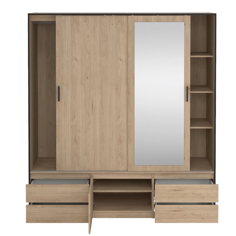 Kogu sarja mööbel on valmistatud kvaliteetsest mööbliplaadist. Kapp on jaotatud kaheks osaks, vasakul pool riidepuutoru ning paremal kolm vaheriiulit. Alumises osas neli metallsiinidel liikuvat sahtlit ning üks uks. Keskmise ukse küljes mugav peegel.