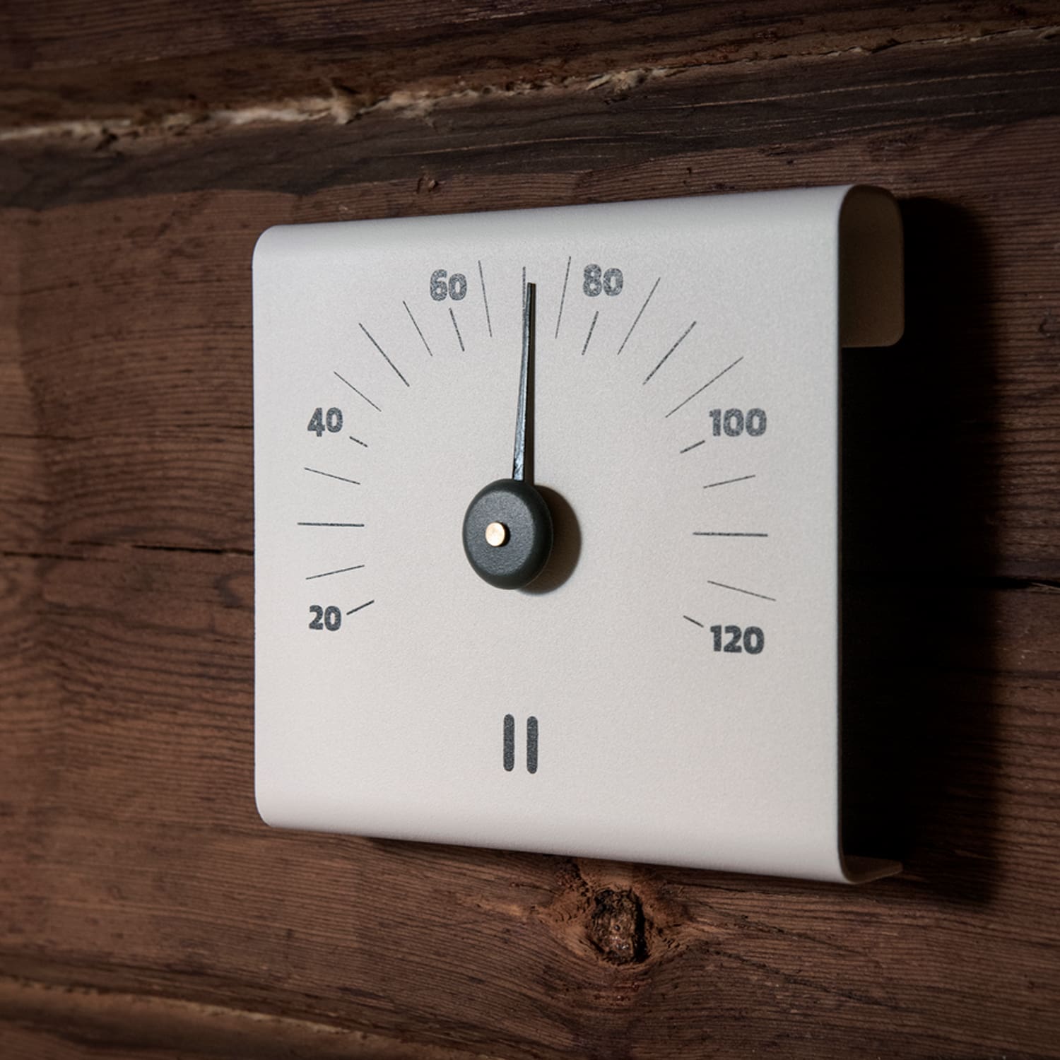 Sauna termomeeter RENTO WHITE, 15 × 14 × 3 cm. Värviline anodeeritud alumiinium.