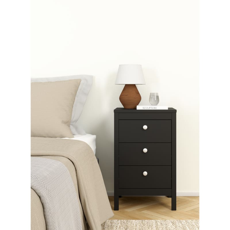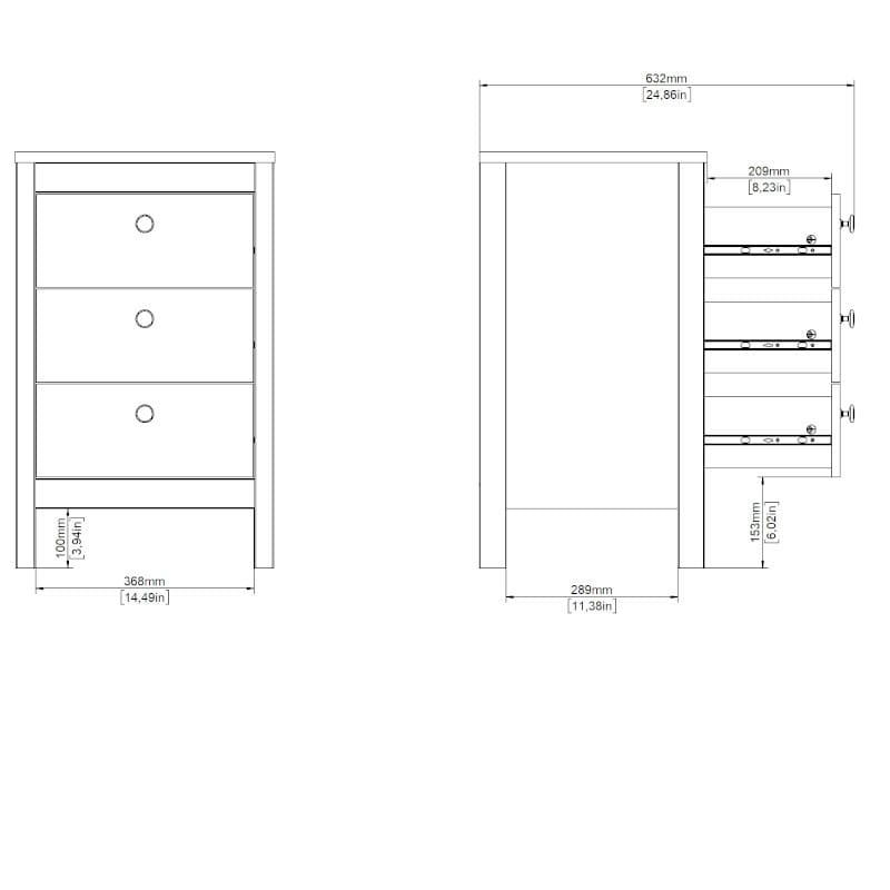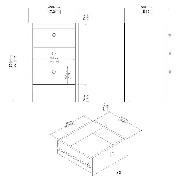 Kogu sarja mööbel on valmistatud mööbliplaadist. Madridi öökapil on kolm sahtlit hoiustamiseks.