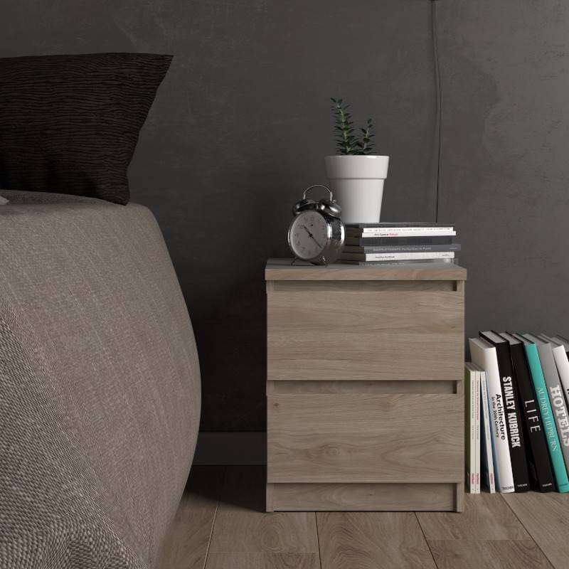 Öökapp Naia on valmistatud kvaliteetsest puiduimitatsiooniga mööbliplaadist. Kapil on kaks metallsiinidel liikuvat sahtlit.