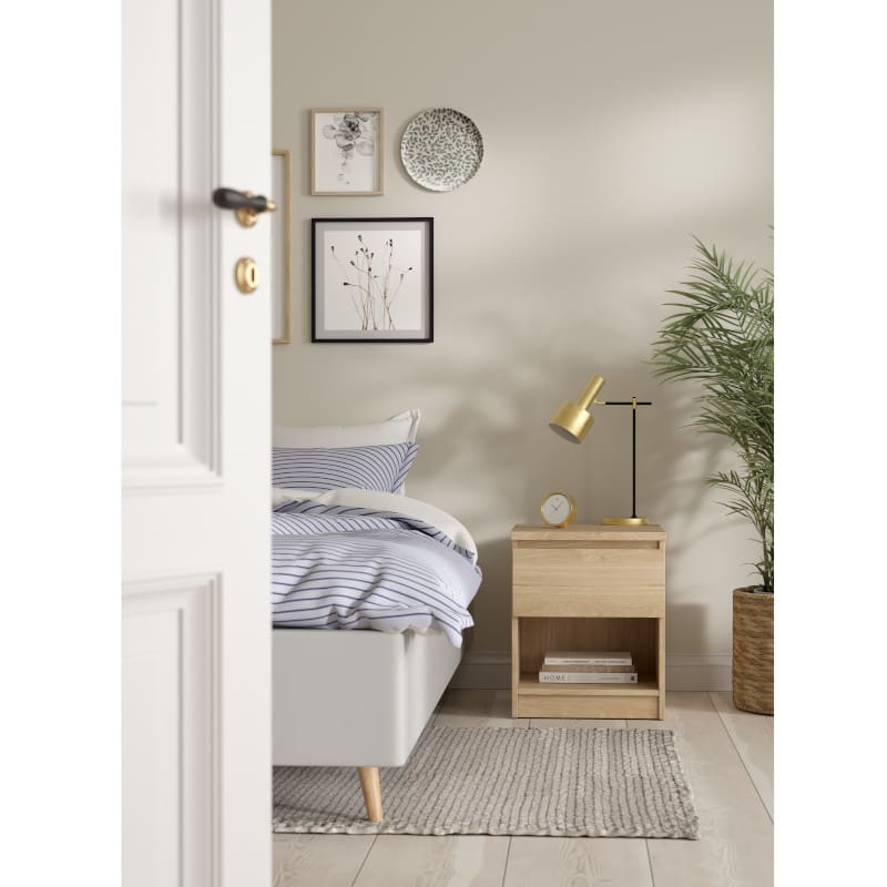 Öökapp Naia on valmistatud kvaliteetsest mööbliplaadist. Kapil on üks riiulivahe ja üks metallsiinidel liikuv sahtel.