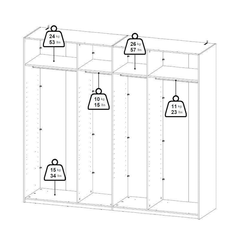 Kogu sarja mööbel on valmistatud mööbliplaadist, saadaval erinevates viimistlustes. Kahe lükandukse taga on mugav hoiuruum- kapp on jaotatud neljaks ning igas osas üleval üks vaheriiul ning riidepuutoru. Uksel olev peegel on praktiline ning avardab visuaalselt ruumi.