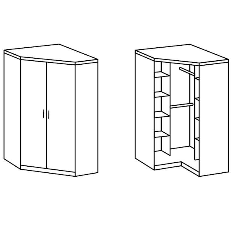 Nurgakapp on valmistatud vastupidavast mööbliplaadist. Kahe peegelukse taga on kokku kaheksa vaheriiulit ning kaks riidepuutoru. Käepidemed on värvitud plastikust.