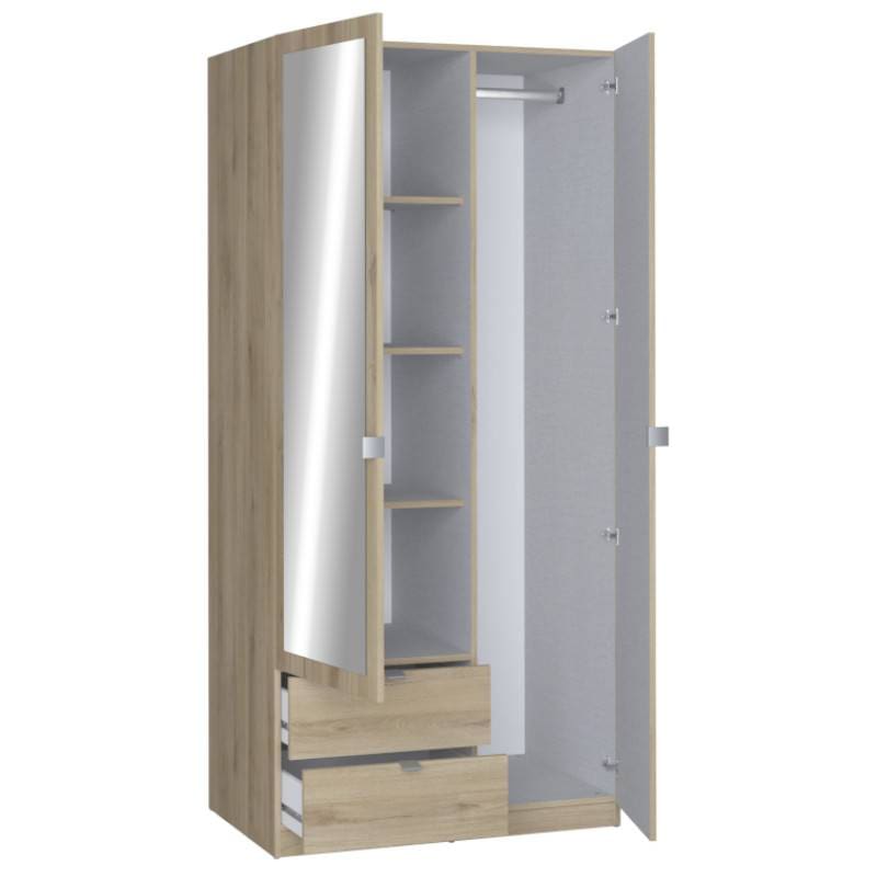 Riidekapp on valmistatud vastupidavast puitlaastplaadist ning kronbergi tamme imitatsiooniga. Kapp pakub häid võimalusi hoiustamiseks- peegelukse taga on kolm reguleeritava kõrgusega vaheriiulit, teise ukse taga riidepuu toru. Kaks sahtlit liiguvad mugavalt metallsiinidel. Sahtli mõõdud 45 x 44 x 15 cm. Käepidemed värvitud plastikust.