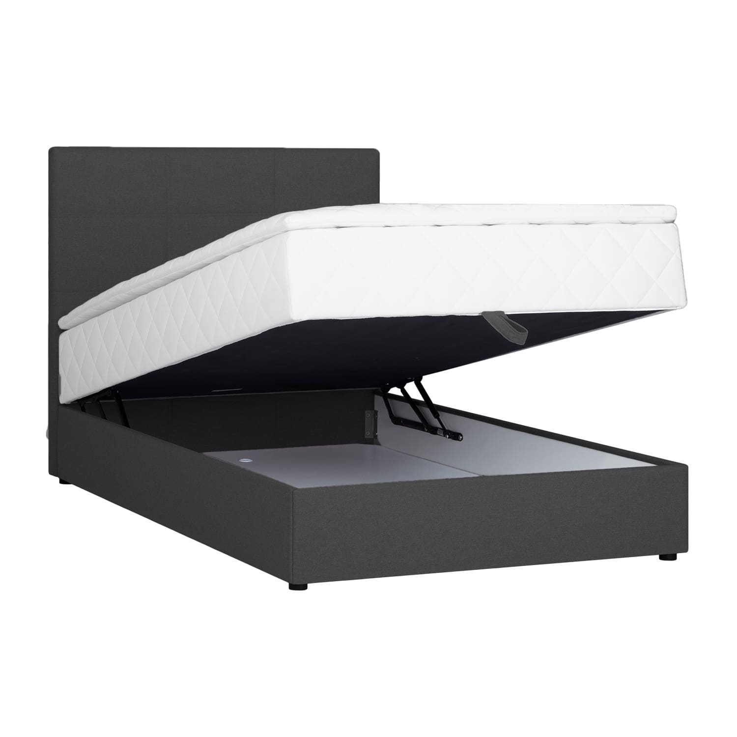 Voodil on pocket-vedrustusega madrats, 210 vedru/m2. Vedrude kõrgus on 13cm. Vedrusid katab 23kg/m3 poroloonikiht, mis on 2cm paks. Madratsi jäikus: jäik. Kattemadratsi sisuks on 23kg/m3 poroloon. Kattemadrats on kaetud 200g/m2 polüestervatiiniga. Voodi all on mahukas panipaik, mis on valmistatud täispuidust ja lamineeritud puitlaastplaadist. Selle küljed on kaetud porolooniga. Voodi karkass on valmistatud täispuidust. Voodiraam on kaetud kangaga, 30 000 Martindale´i. Komplekti kuulub voodipeats, mis on voodiga sama lai. Peatsi paksus on 7cm. Kaasas on ühenduselemendid peatsi kinnitamiseks voodi külge. Voodil on neli plastikust jalga, mis on musta värvi. Voodijalgade kõrgus on 2,5cm, kattemadratsi kõrgus 4cm, madratsi kõrgus 16cm. Voodi magamispinna kõrgus on 52cm. Toote mõõdud on 123x210xH114,5cm. Toode on valmistatud EL-is.