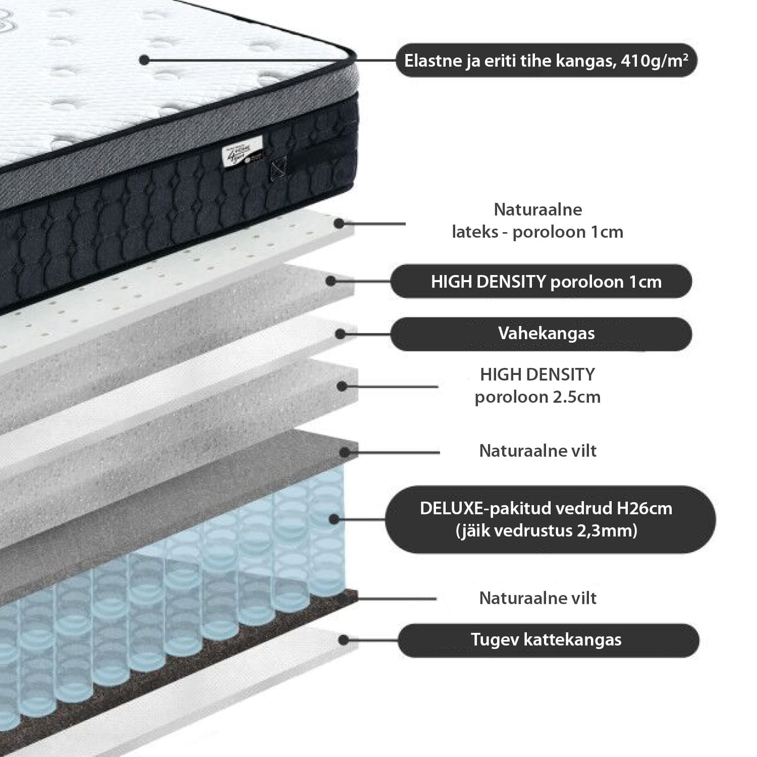 Vedrumadrats HARMONY DELUX 140x200cm. PERFECT SLEEP BY HOME4YOU. Jäigema vedrustusega ja naturaalse lateksi kihiga kvaliteetne vedrumadrats on kõrgusega 30cm. Madratsil on pakitud deluxe-pocket vedrustus (2,3mm/jäik). Hele stretch-kangast madratsikate on nahasõbralikust ja pehmest puuvilla-polüestrist (kangakaal 410g/m2). Madratsis on pealmiseks kihiks naturaalne lateks, mis on pehme, elastne, õhku läbilaskev ning reguleerib ise oma niiskussisaldust. Lisaks on madratsis kaks erinevat kvaliteetset poroloonikihti, mis tagavad lihaste ja luustiku maksimaalse lõdvestuse. Kangas, vilt ja vatiin vastavad rahvusvahelisele Öko-Tex 100 standardile. Madrats on pakitud rulli, et seda oleks lihtsam transportida. Madrats vajab oma esialgse kuju taastamiseks kuni 2 tundi aega. Eemaldage ettevaatlikult kilepakend ja asetage madrats voodi peale. Toote mõõdud on 140x200xH30cm.