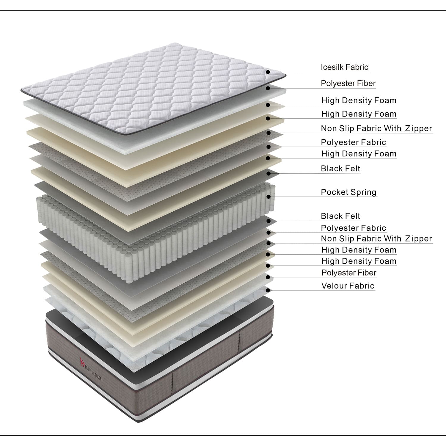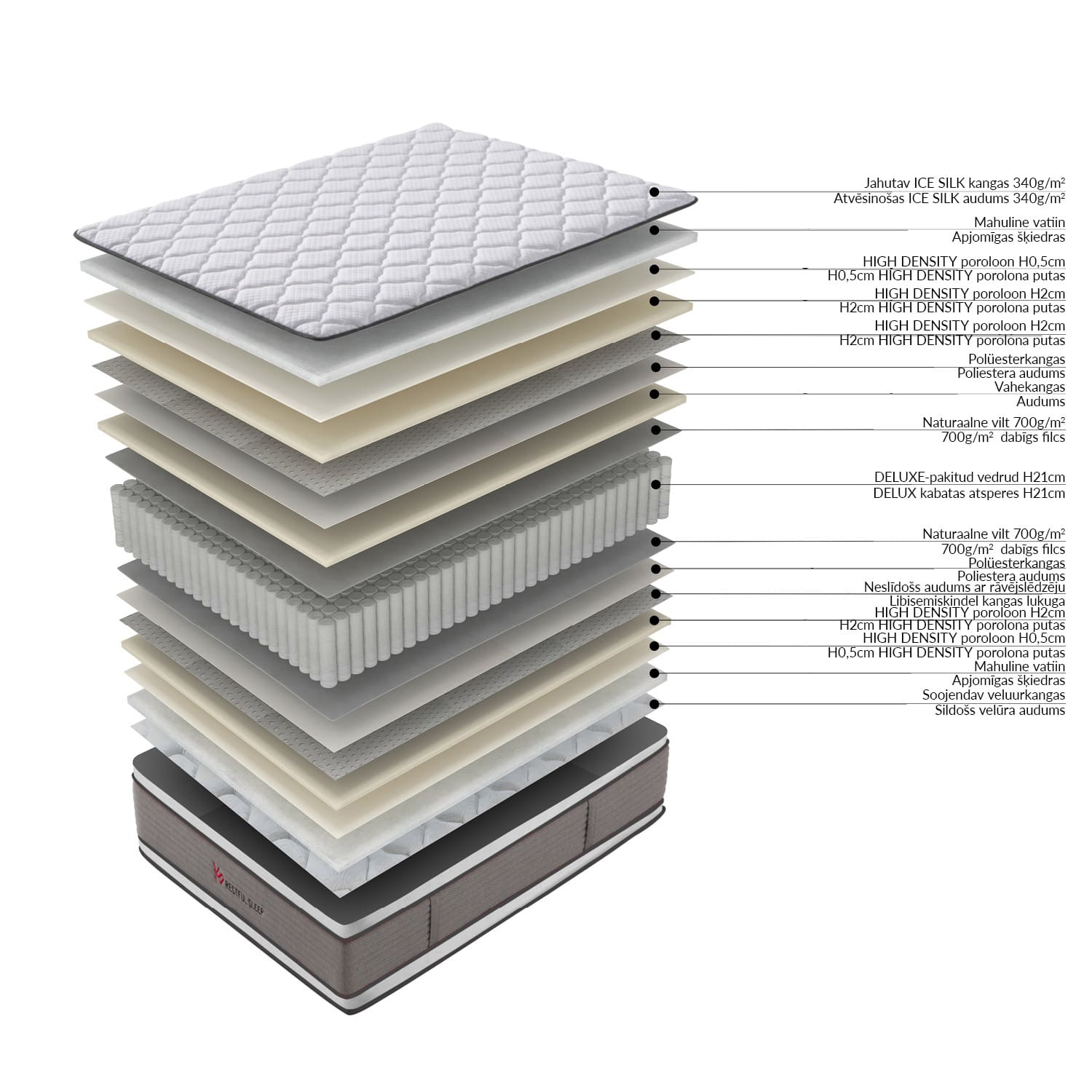 Vedrustus: DELUXE-pakitud vedrud 2,3mm/jäik, kõrgus 21cm. Vedruploki mõlemad pooled on kaetud 700g/m2 naturaalse vildikihiga.