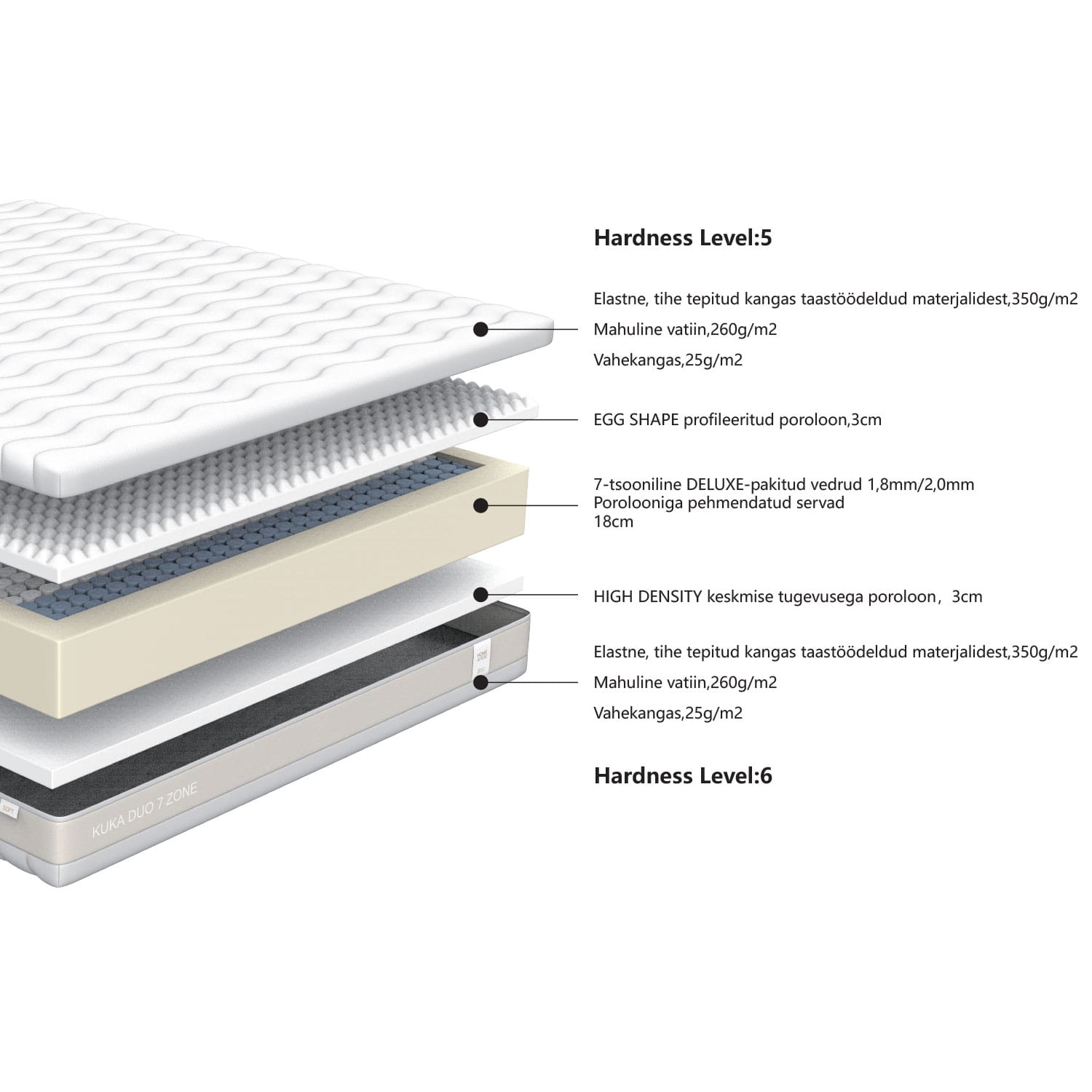 7-tsooniline DELUXE-pakitud vedrud (1,8mm/2,0mm), kõrgus 18cm. 7-tsooniga madrats on kohandatud toetama pead, kaela, õlgu, alaselga, puusasid ja jalgu.