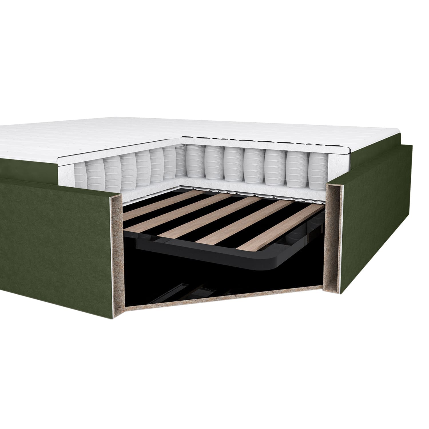 Kontinentaalvoodi LEENA 160x200cm, madratsiga, roheline. Komplekti kuulub 7-tsooniline pocket-vedrustusega madrats (250 vedru/m2). Madratsi jäikus: jäik. Voodil on praktiline panipaik, mis on metallist tõstemehhanismiga. Panipaiga sügavus on 26cm. Voodiraam on valmistatud puitlaastplaadist ja suure tihedusega puitkiudplaadist. Raam on kaetud polüesterkangaga, Martindale 115 000. Voodijalad on valmistatud täispuidust ja on 2,5cm kõrged. Komplekti kuulub peats, mis on kaetud polüesterkangaga. Kinnituselemendid on komplektile lisatud. Madratsi mõõdud on 160x200cm. Toote mõõdud on 176x221xH110cm. Toode on valmistatud EL-is.