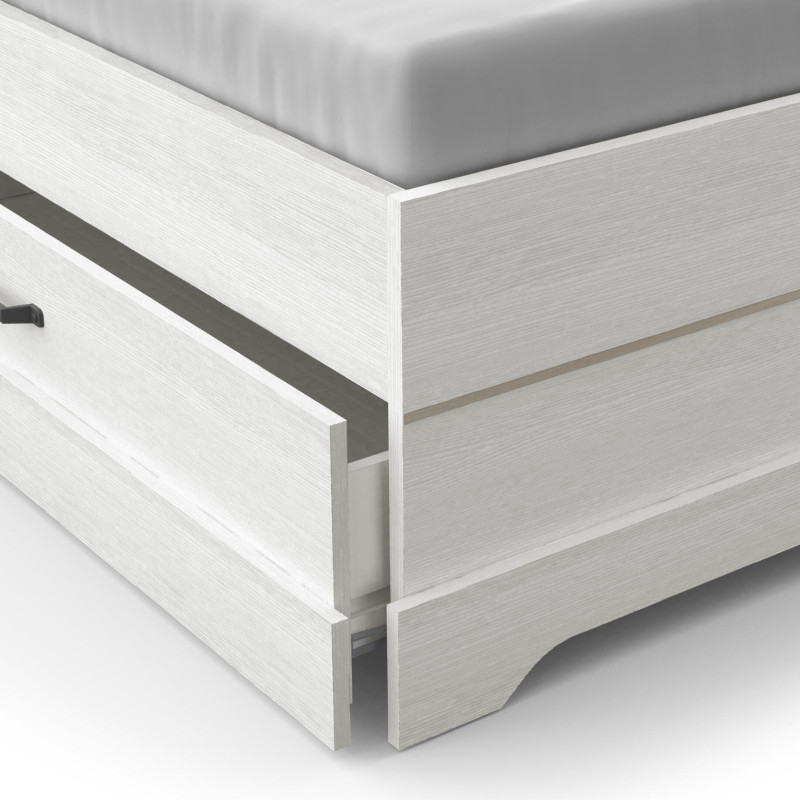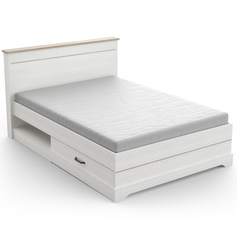 Mööbli ajas kestvuse tagab kvaliteetne mööbliplaat, mis on osaliselt valges toonis ning kronbergi imitatsioonis. Suurepäraseid hoiustamis võimalusi pakuvad voodi all olevad kaks suurt sahtlit + kaks avatud osa. Voodipõhi ning madrats ei kuulu komplekti, sobib raamiga voodipõhi.
