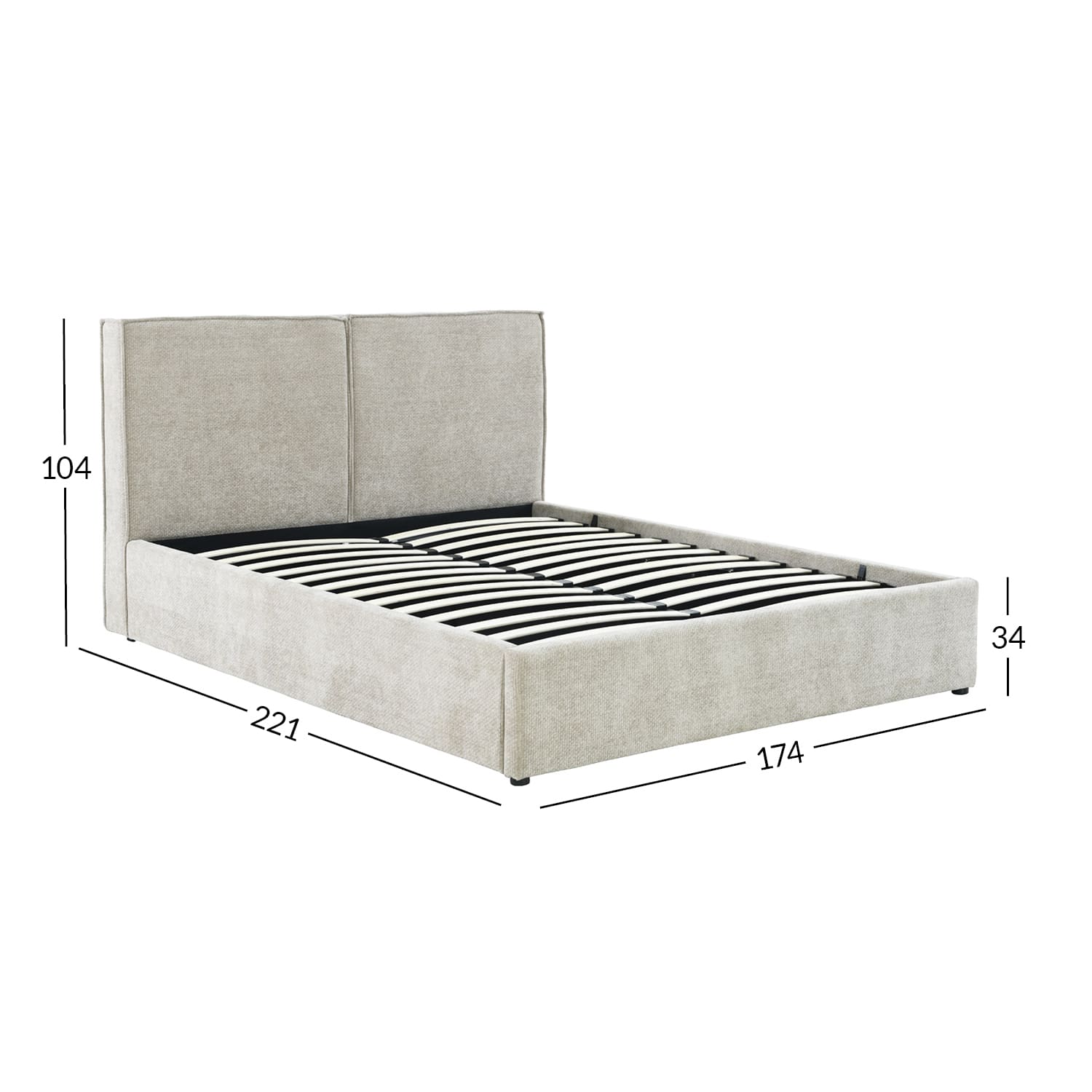 Voodi üldmõõdud on 174x221xH104cm. Voodiraami kõrgus 34cm.