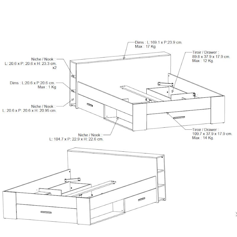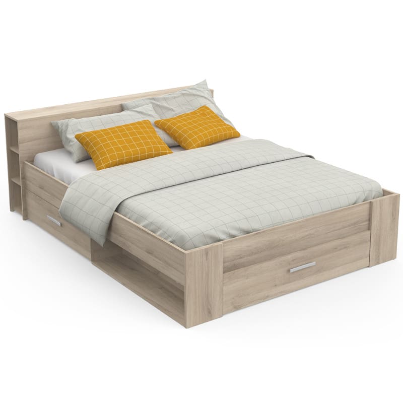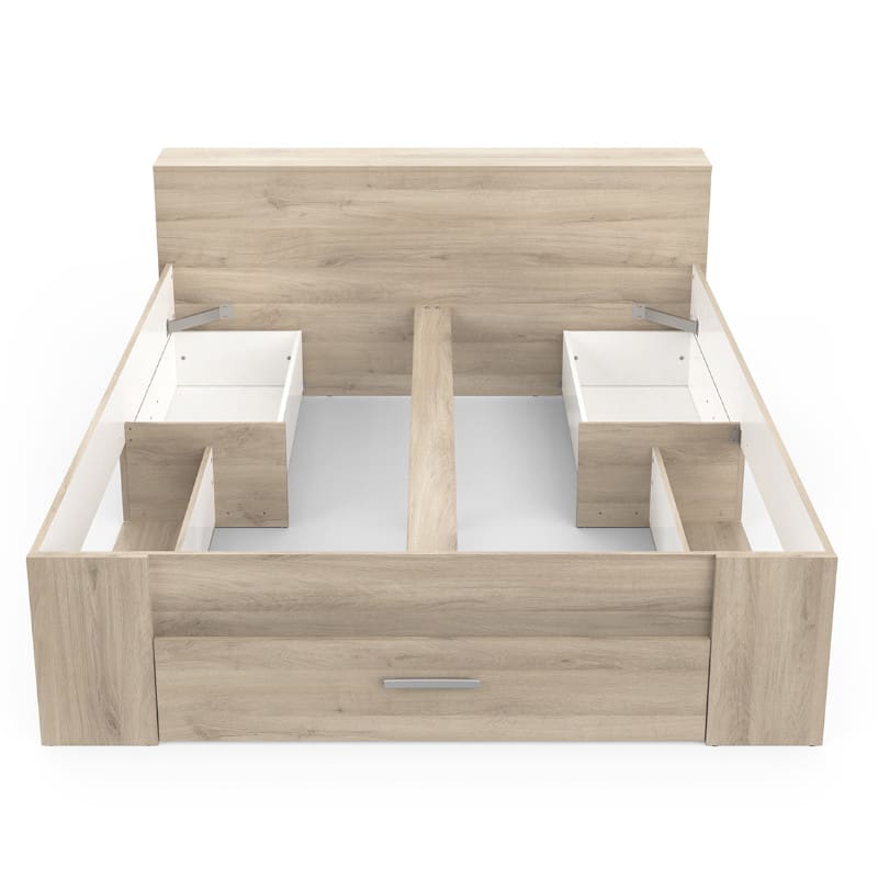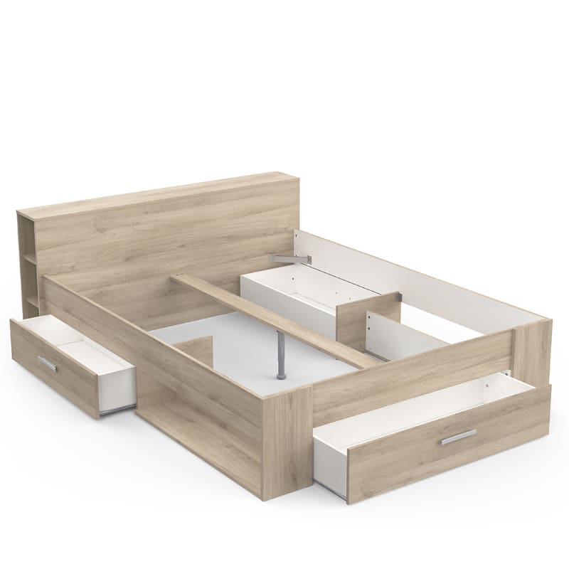Lisaks on voodil kolm sahtlit ja kaks avatud osa, mis sobivad ideaalselt panipaigaks või dekoratiivsete esemete väljapanekuks. Voodi on saadaval erinevate viimistlustega, et sobida igasse magamistuppa. Voodipõhi ning madrats ei kuulu komplekti. Voodile sobib raamiga voodipõhi.