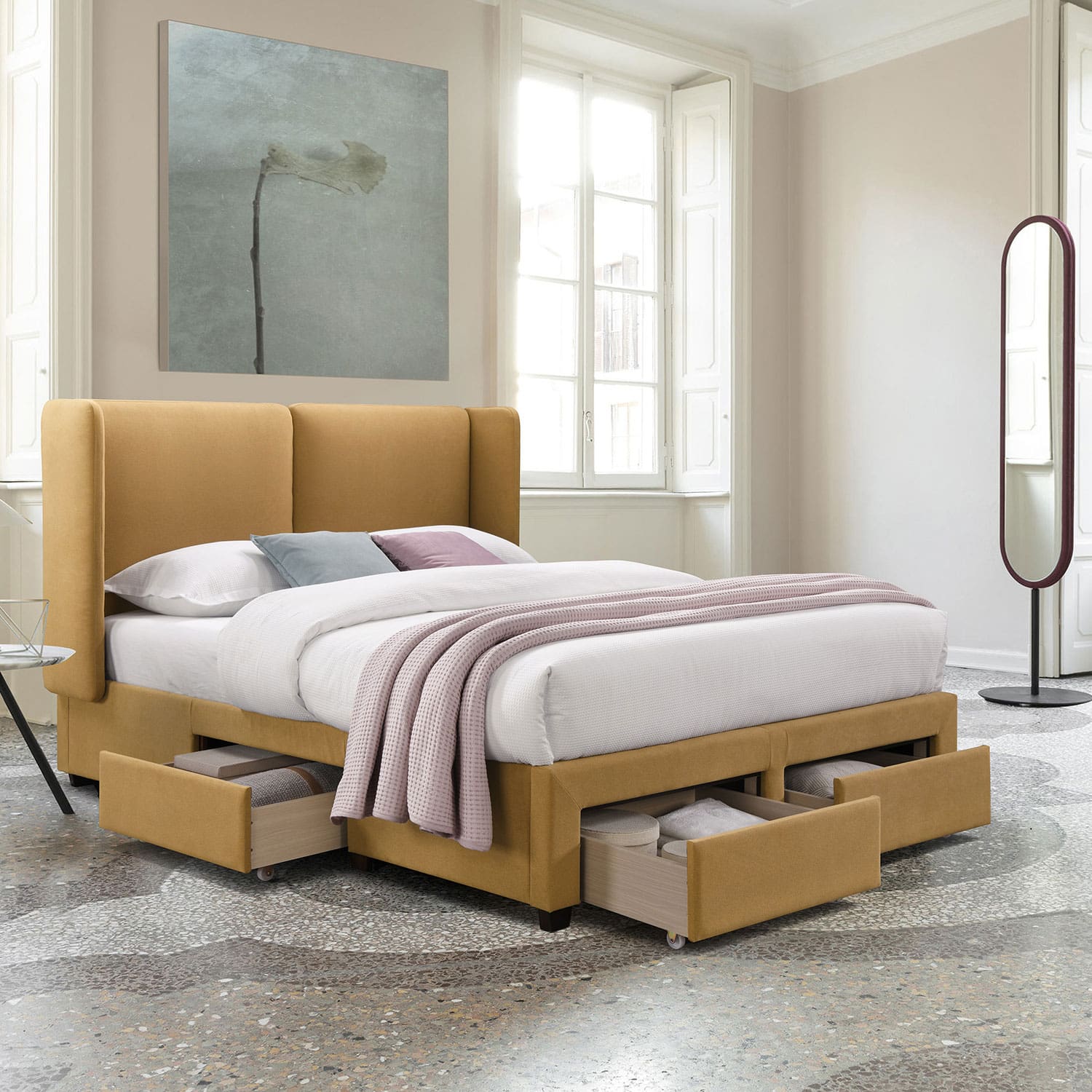 Voodi SUGI 4-sahtliga, ilma madratsita 160x200cm, kollane.